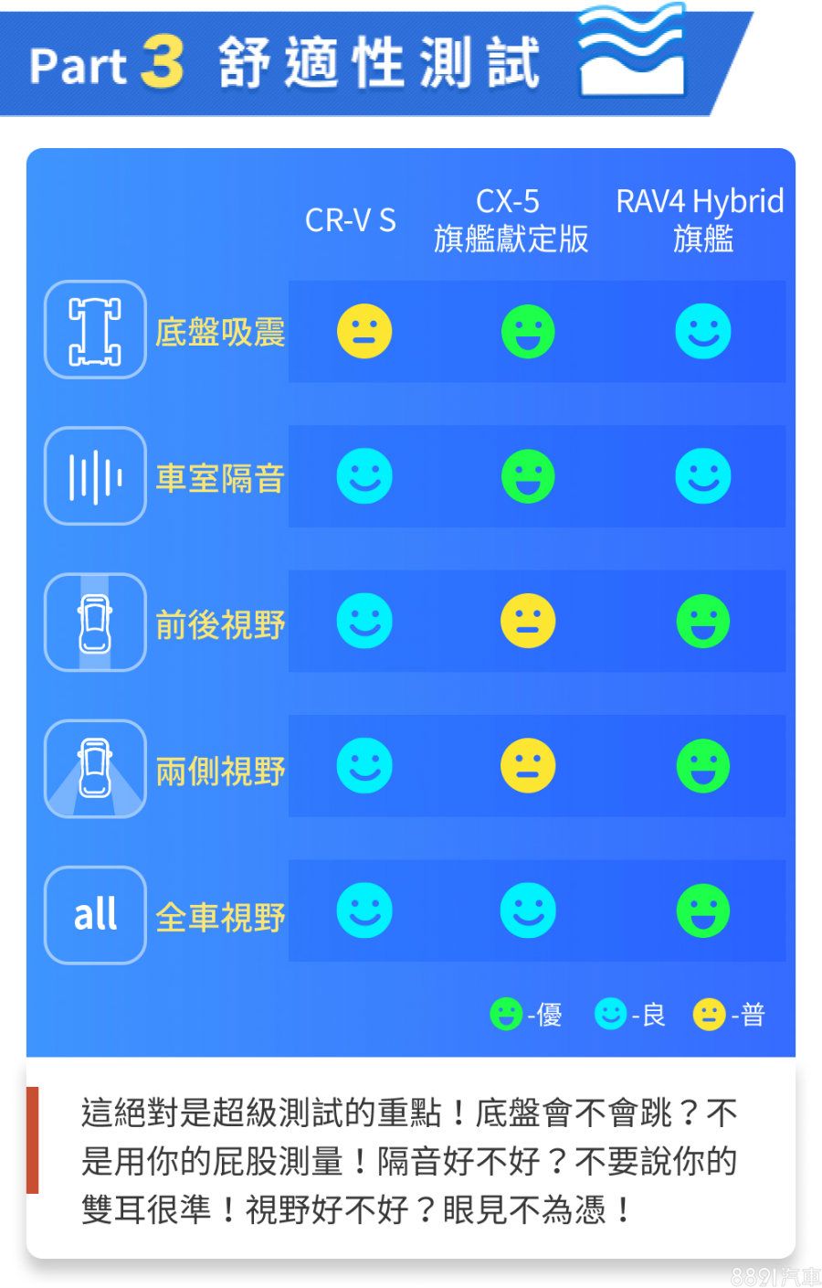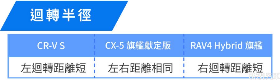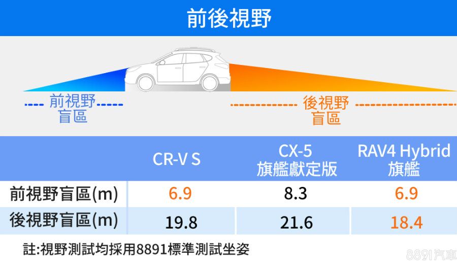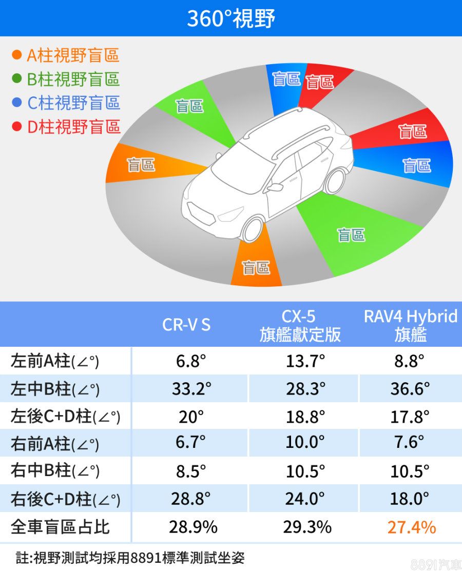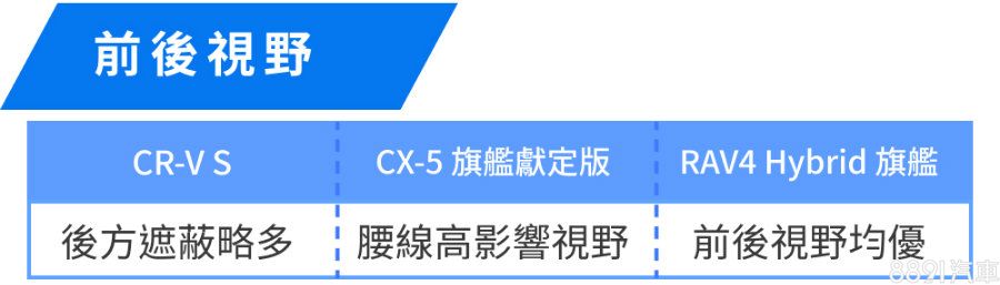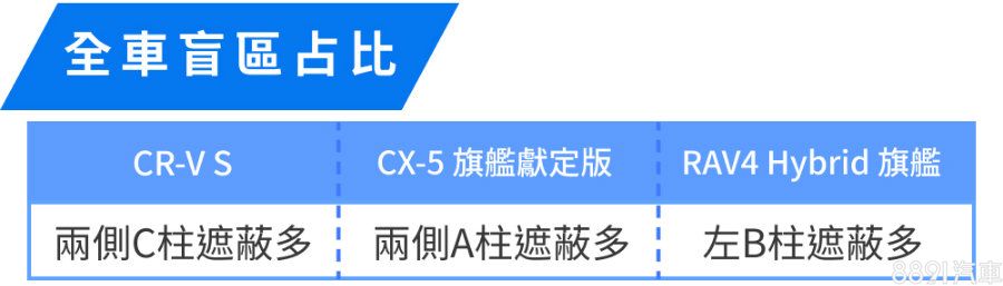 RAV4整體盲區表現較佳,CR-V雖然在前方及左右視野較佳,但兩側斜後方向之死角均大於另兩對手,而CX-5各方向之視野遮蔽率則未有突出表現。