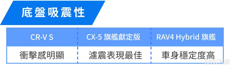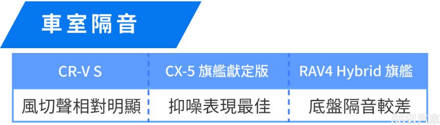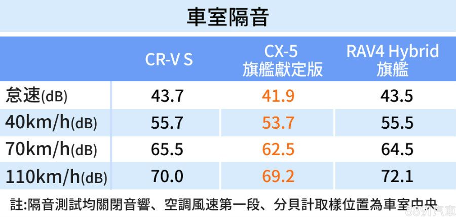 RAV4 Hybrid引擎運轉聲與風切聲輕微,但底盤抑噪表現較差,隨速度提升越明顯,CR-V S則是高速風切聲較大,兩者雖各自有美中不足之處,但實際上路都還在接受範圍中。本次隔音表現最好的是CX-5,不論是低速時的引擎隔絕,還是上高速抑制風切聲,都有高水準演出,數據上無論在哪個速域,都勝過兩位對手,當然也對行路質感加分。