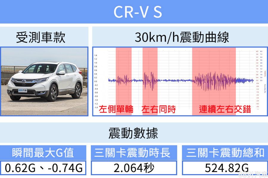 在時速30km/h震動測試中,CR-V在數據上明顯無優勢,不但G值高、時長久,震動總和也達到524.82G,實際上衝擊感也相對明顯,面對連續左右交錯關卡時,也因懸吊無法快速吸收震盪,讓車身搖晃程度略大一些。