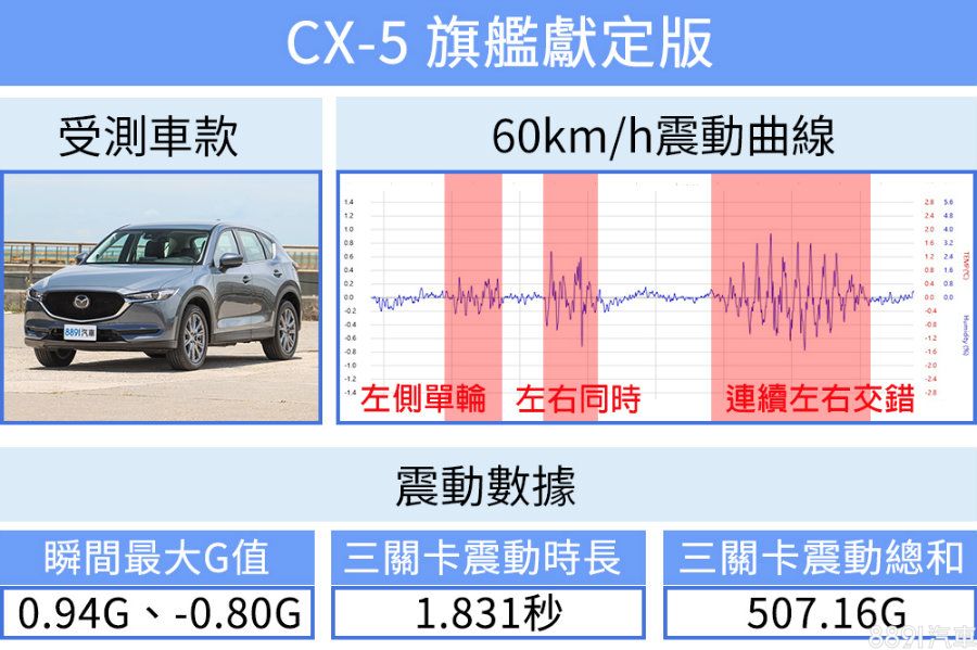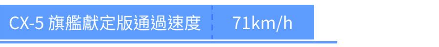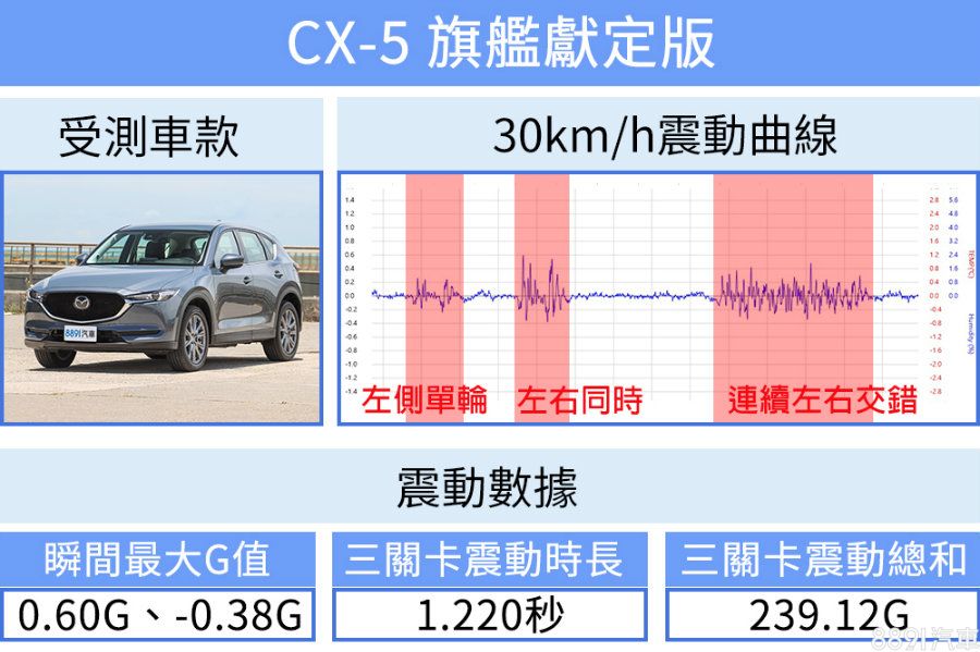 CX-5在60km/h速域依然能有效吸收震盪,不但震動圖形平穩、無突然瞬間受力,瞬間最大G值也低於對手,衝擊感受是三車中最輕微,但在柔軟的懸吊設定下,通過減震墊還是有輕微二次彈跳產生,因此震動時長1.831秒略長一些,即便如此,體感還是最舒適者。