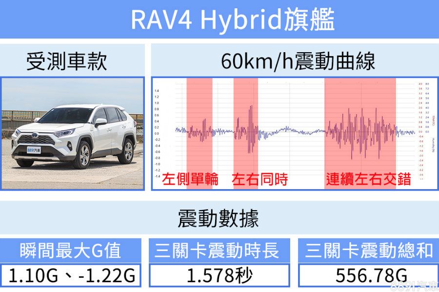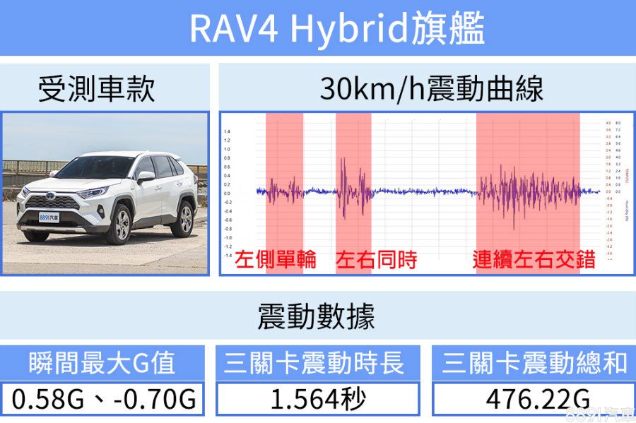 RAV4 Hybrid低速震動G值不小,達到僅次於CR-V的0.50、-0.70G,但進入左右交錯陣行時車身反而較為穩定,顯見避震阻尼調配得宜,面對連續彈跳時可有效吸收震盪,實際在路上行駛時舒適度也不差。