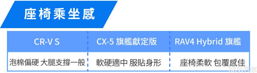 RAV4擁有最柔軟的座椅設定,座椅剪裁貼身,且帶點「浸沒式」的包覆感,坐起來相當舒適,也針對駕駛座提供2組記憶設定。不過座椅側向支撐性相對稍嫌不足,而包覆的人造皮料在設計上也略顯平板,質感表現敬陪三車末座。
