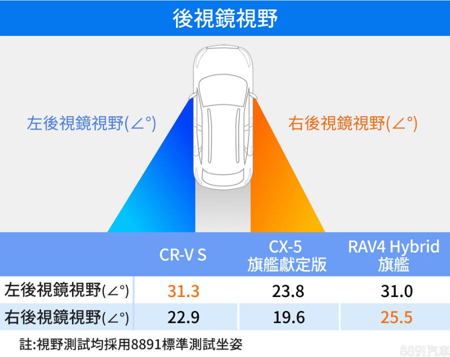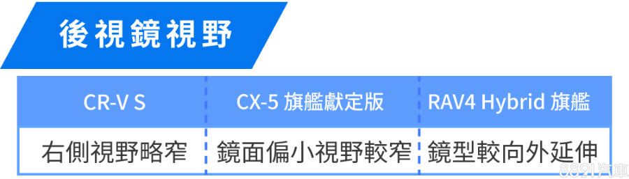 CR-V由於後視鏡設計方正,能提供不錯的映照範圍,不過RAV4藉著較為外展的鏡面,右側後視鏡能提供的視野小勝些許,至於CX-5本身因為鏡面設計較窄,能提供的視線廣度也相對受限。不過,相關電子輔助方面,CX-5將盲點偵測及RCTA列入標配,RAV4除了入門款均配備盲點偵測,而CR-V則能在打右方向燈時提供右側盲區顯影。