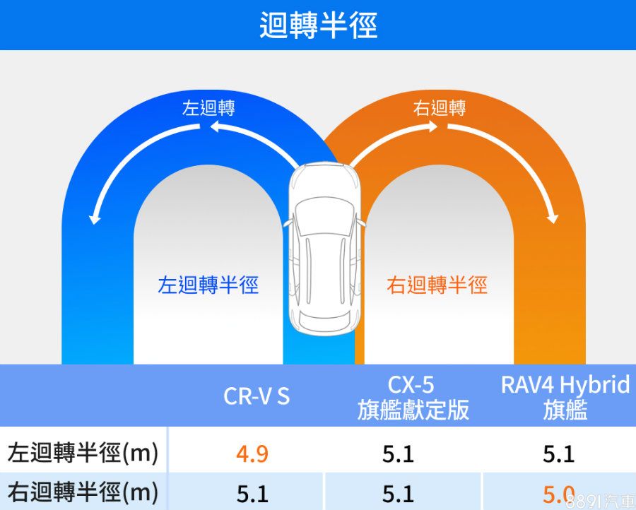 參考過去測試經驗,中型休旅車款之迴轉半徑多為5m左右,而本次受測的三款車型,也大概落在合理範圍內,彼此間差異並不顯著。