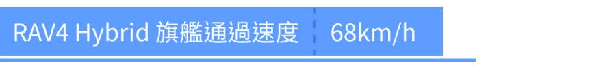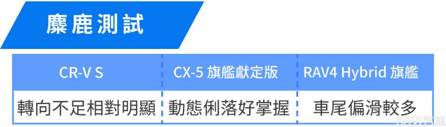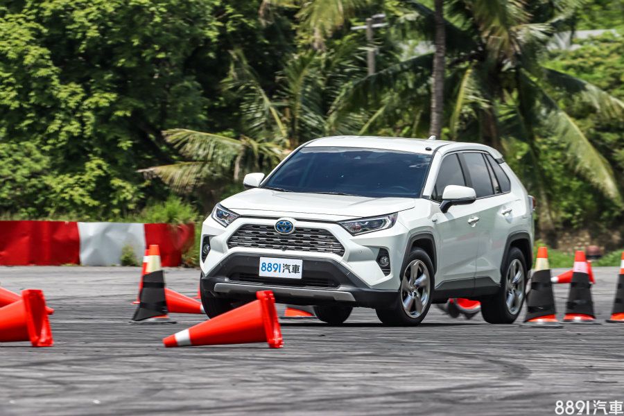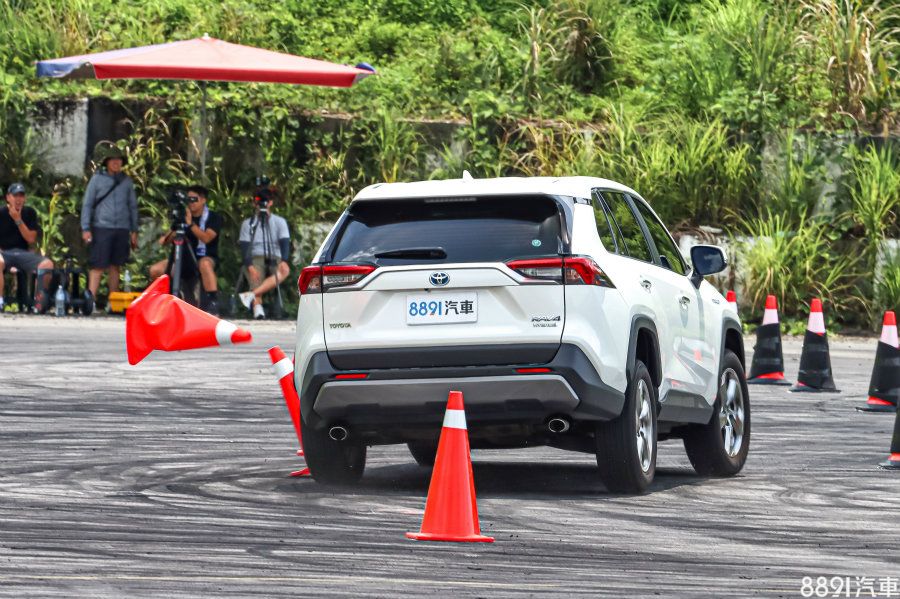 RAV4 Hybrid麋鹿測試是這次三車最差者!車速68km/h進入第一個向左閃避,車身動態算是聽話,不過進入第二車道時,可以看出轉向反應慢了一點點,讓車身有點向外偏滑,且車尾也有明顯向外擺動的情形,相當貼近錐桶,但終究沒碰倒,因此過關!