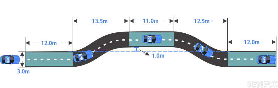 依照超級測試單元宗旨,每一測試項目都會明定測試標準,麋鹿測試也不例外,我們參考歐洲媒體測試規範,調整為8891自己的麋鹿測試規範,車道寬度/長度、換道間距都予以固定,也維持同一駕駛。