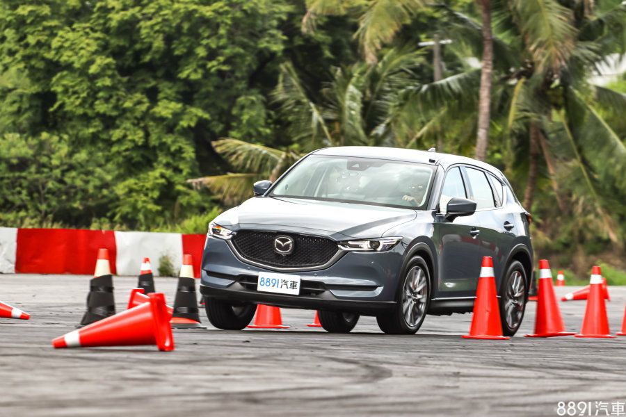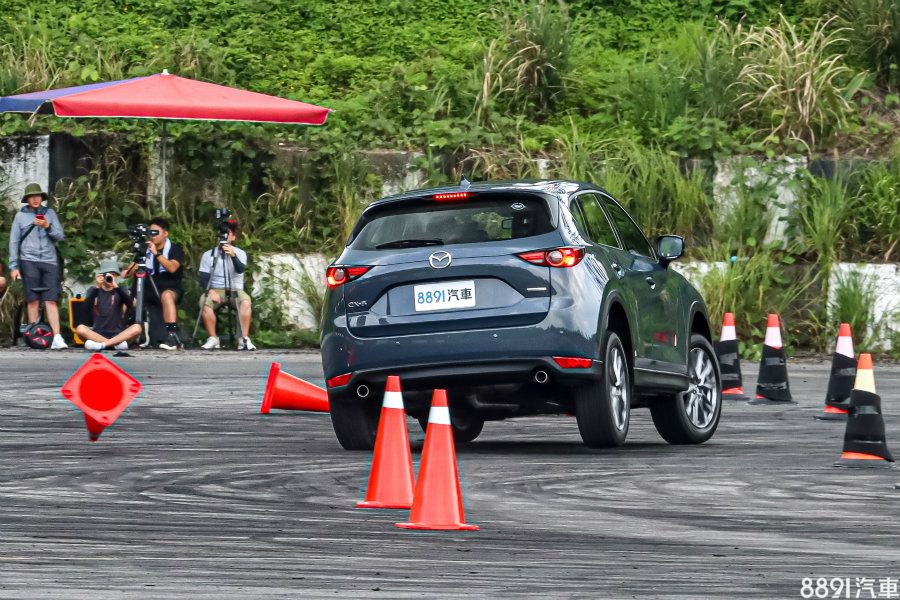 CX-5以車速71km/h進行第一個向左閃避,再連接變化車道,可以清楚看出CX-5動態頗為俐落,幾乎沒有猶豫的感覺,車尾有些微偏滑,但在動態穩定系統的幫助下,並不影響車身動態,很順暢的再進入第三車道,輕鬆通過陣仗。
