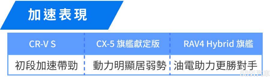 RAV4 Hybrid綜效馬力有218hp,是三車最大者,比CR-V的193hp大了25hp,不過RAV4 Hybrid直線底末速約為143km/h,和CR-V的144km/h算是平手,並無展現馬力優勢,這其實和豐田油電動力的特性有關,比起渦輪引擎,並不擅長高轉速、高速度的發揮。