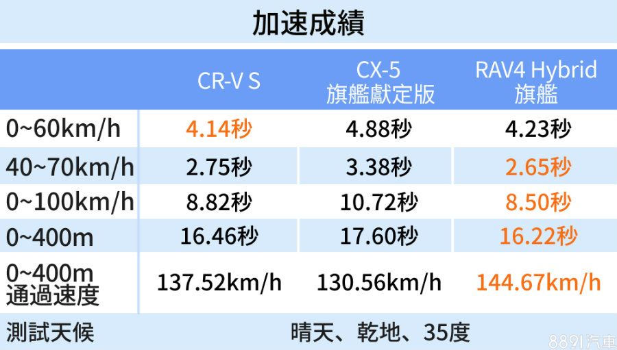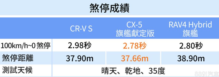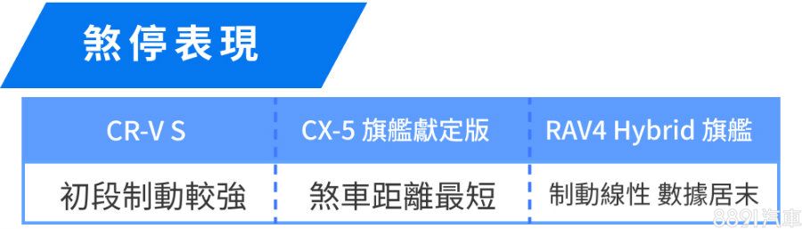 檢視實測成績,低轉爆發力不俗的CR-V在初段加速略勝RAV4一籌,隨著車速加快才被追過,0~100km/h以8.82秒完成,小輸RAV4的8.5秒;進入高速領域則換RAV4佔上風,大排氣量帶來出色的動力延伸性,率先以16.22秒通過400m,末速更達144.67km/h,高出CR-V不少。至於CX-5,雖然起步剎那前輪小幅打滑衝出,但動力最小的先天條件難以與對手抗衡,成績敬陪末座。