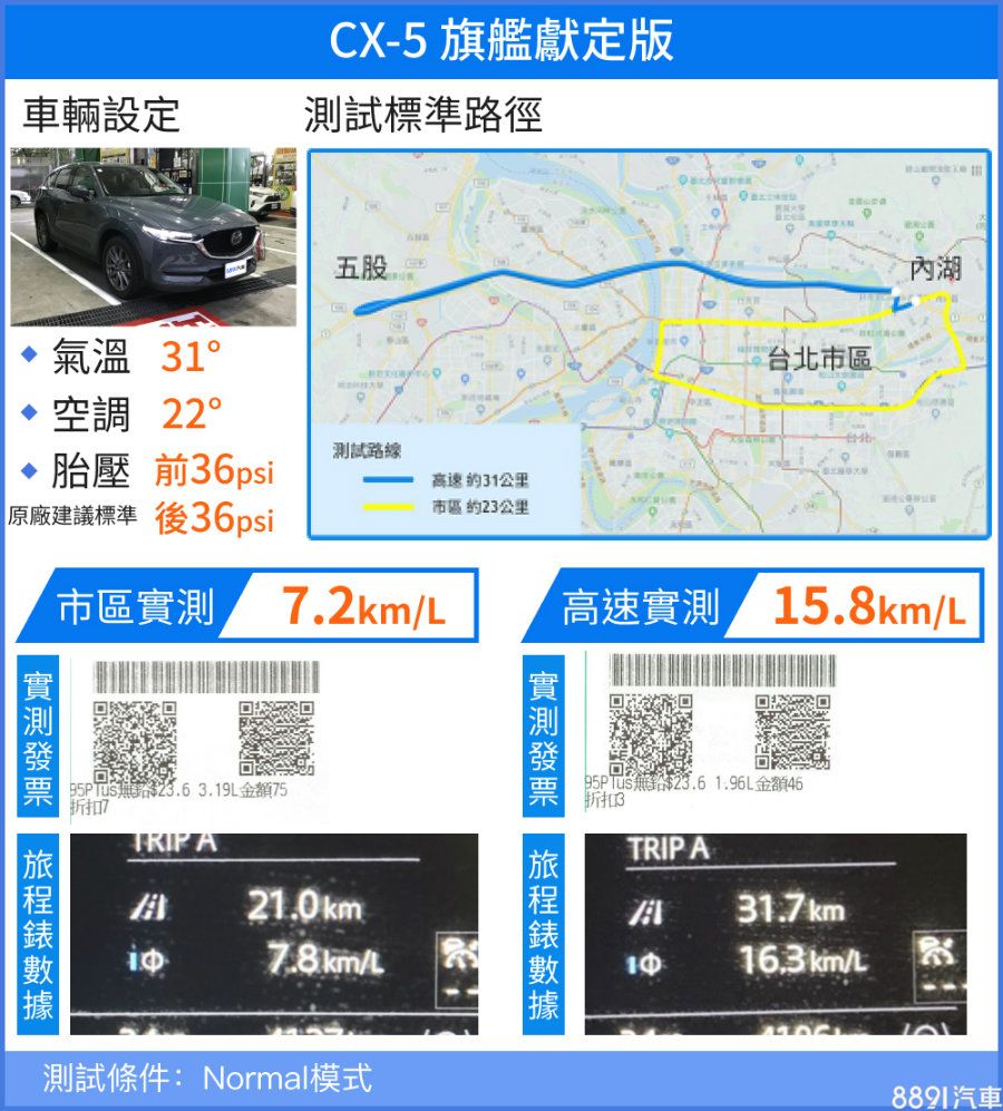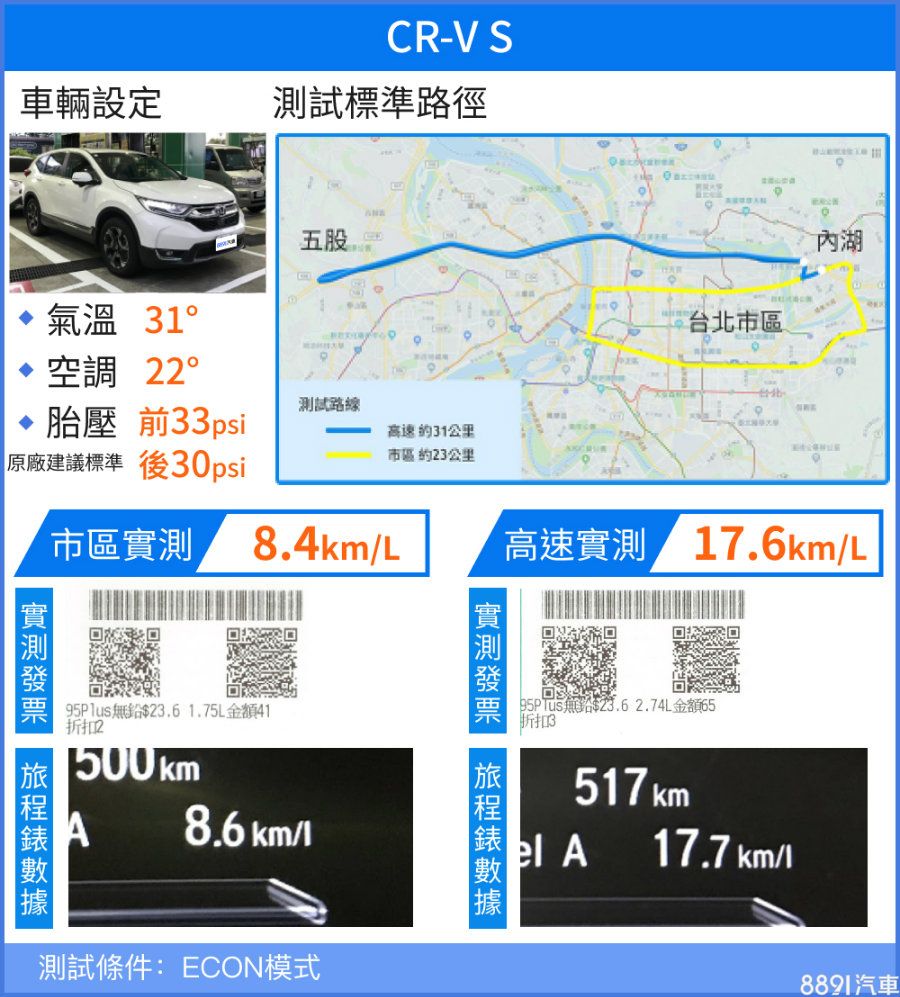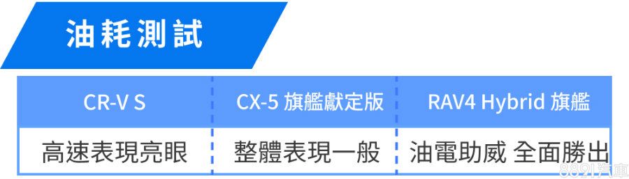 本次油耗施測,高速路段大致順暢,三車高速油耗均繳出不錯的成績,RAV4在油電系統的加持下,更有著22km/L的亮眼表現,而配備有ECON節能模式的CR-V,高速成績也頗具水準,CX-5相形之下並非特別突出。
