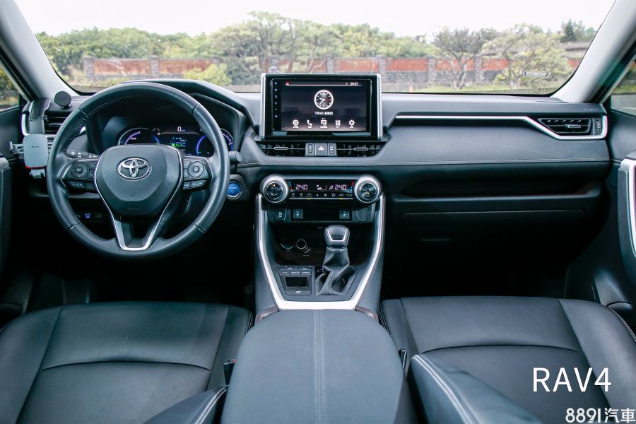 RAV4 Hybrid內裝設計與汽油版完全相同,沒有專屬設計,整體看來架構簡潔,大型化按鍵、旋鈕在使用上十分就手,上層使用軟質塑料、冷氣出風口周邊則採皮質包覆,不論視覺、觸覺呈現都算有質感。排檔座周邊設有多處開放式置物空間,隨手小物很容易就能找到合適位置,拿取相當順手。