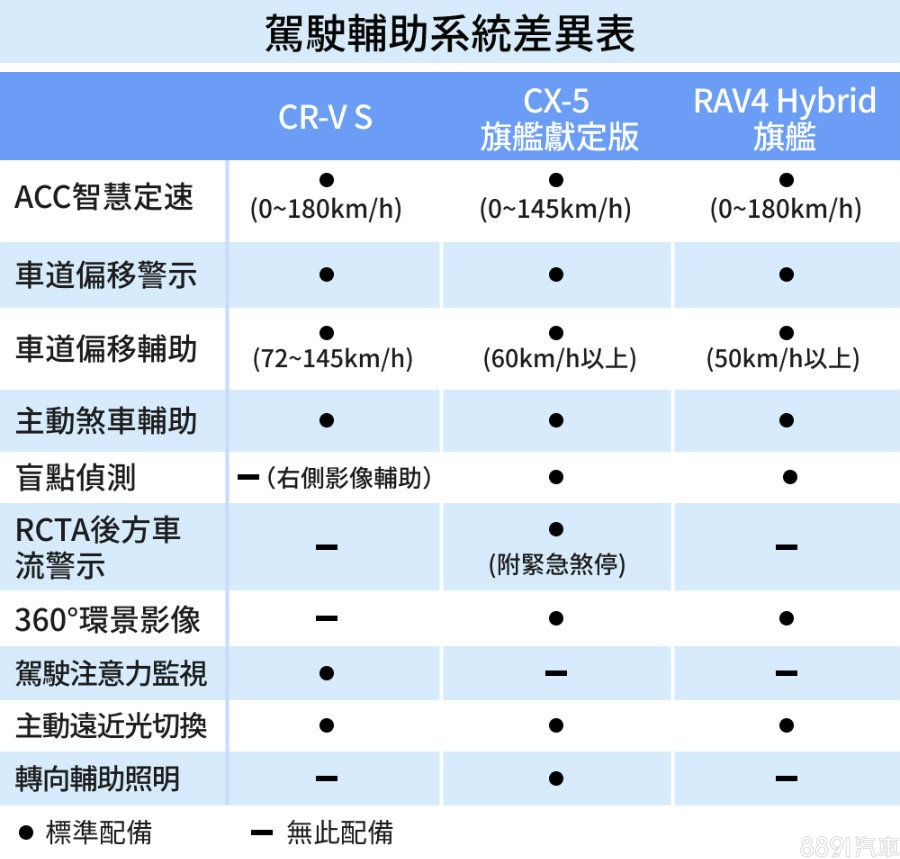 消費者安全意識抬頭,新世代休旅主動安全皆備,像是RAV4有TSS 2.0、CR-V有Honda Sensing、CX-5有i-Activsense,均為全車系標配,但彼此間的完善度還是稍有落差。受測3款車皆有全速域ACC,但系統作動範圍有差,對應國內高速公路使用環境問題不大,盲點偵測方面僅CR-V未配備,僅利用右側鏡頭在打方向燈時提供畫面輔助,而360度環景影像同樣是CR-V獨漏,綜觀下來,CX-5的駕駛輔助系統最完善。