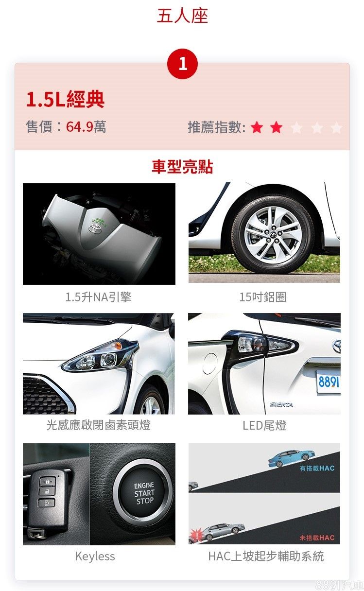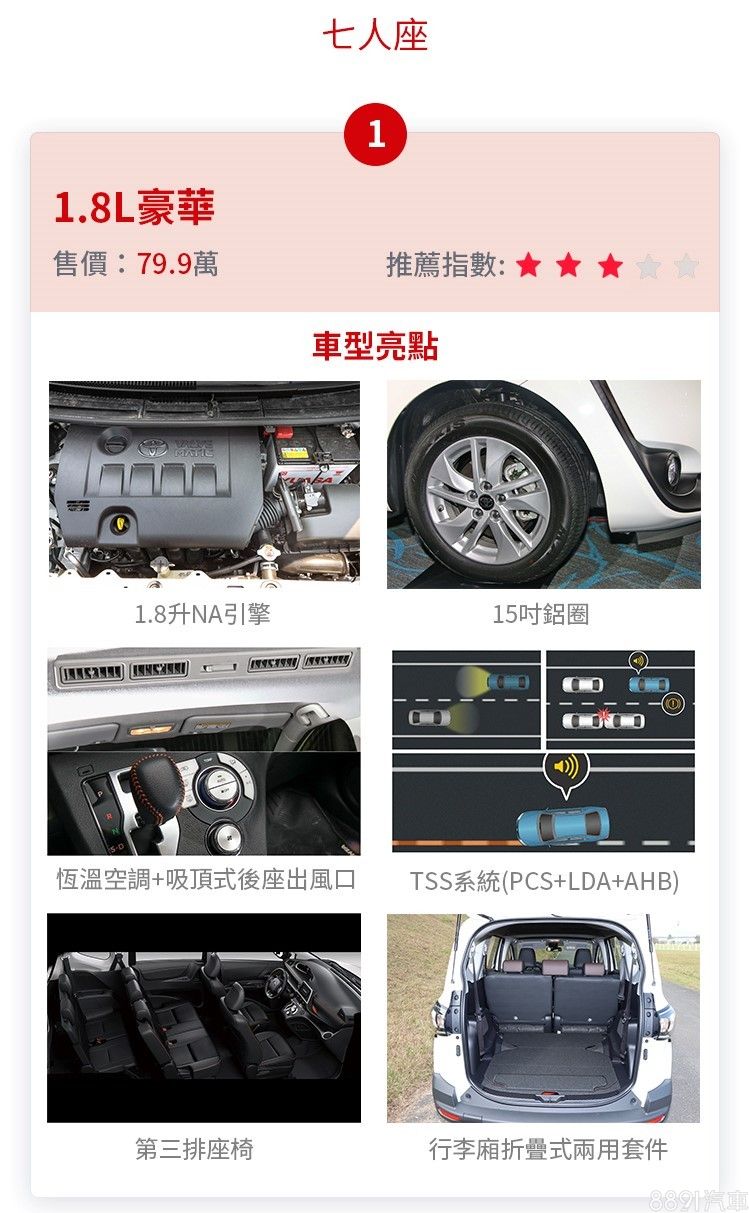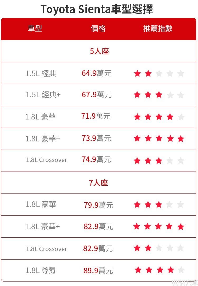 雖然就銷售報告來看,有近7成的消費者選擇Sienta五座,不過「備而不用」的第三排也能對應預算有限、但有載人需求的買家具備相當的吸引力,有鑑於此,推薦車型將會五人座及七人座各擇一。