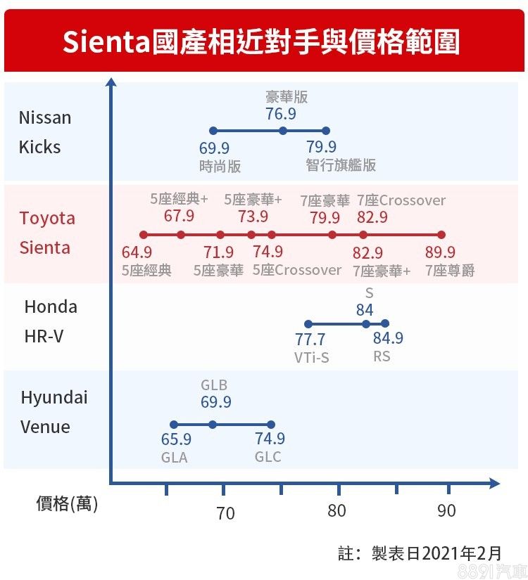 嚴格來講,Sienta目前在國內小型MPV沒有明確競爭對手,因為原本視為競品的Kia Carens已經在去年底下台一鞠躬,不過這也不代表Sienta就「越吃越開」,因為近年來崛起的跨界小休旅,儼然成為一大威脅,其中又以Nissan Kicks表現最為強勢,在國內2020年度休旅銷售排行榜上名列第四,而Sienta僅能排在第六。不過即便如此,Sienta的靈活空間運用與三排座的高機能性,同樣是對手無可取代的產品特點。
