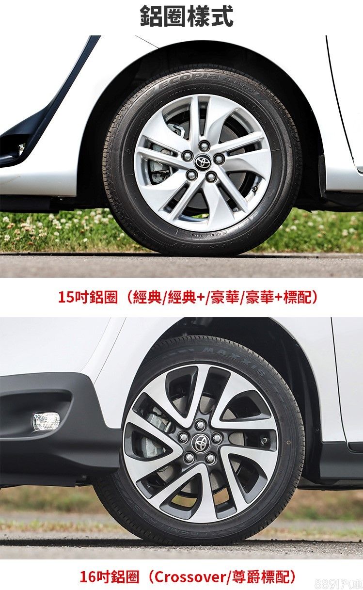 Sienta雖然提供多元車型配置,但鋁圈僅有兩種配置,經典與豪華版均配置15吋鋁圈,造型簡單,Crossover及尊爵版升級16吋鋁圈,雙色點綴讓視覺效果更顯活潑,稍嫌可惜的是Crossover車型並沒有專屬胎圈,難以凸顯產品特色,獨特性上略有打折。