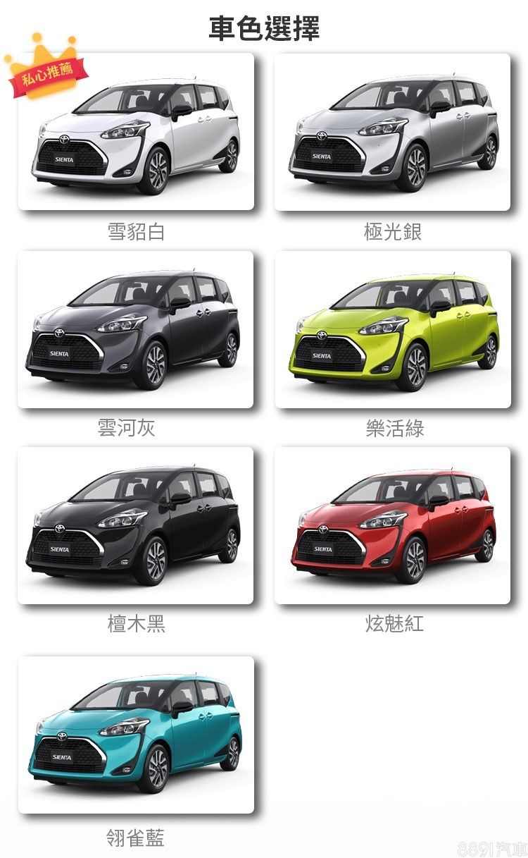 Sienta提供多達7種車色,除了有白、銀、黑、灰等「大眾色」之外,另有主打年輕族群的亮色系選擇,包含樂活綠、炫魅紅、翎雀藍都是相當鮮豔跳Tone的色調,至於Crossover車型因為有「黑色車頂」的選配,因此車色不提供檀木黑的選項。個人推薦的車色還是能見度頗高的雪貂白,看來順眼、夜晚辨識度高,也符合這類家用MPV的沉穩風格。