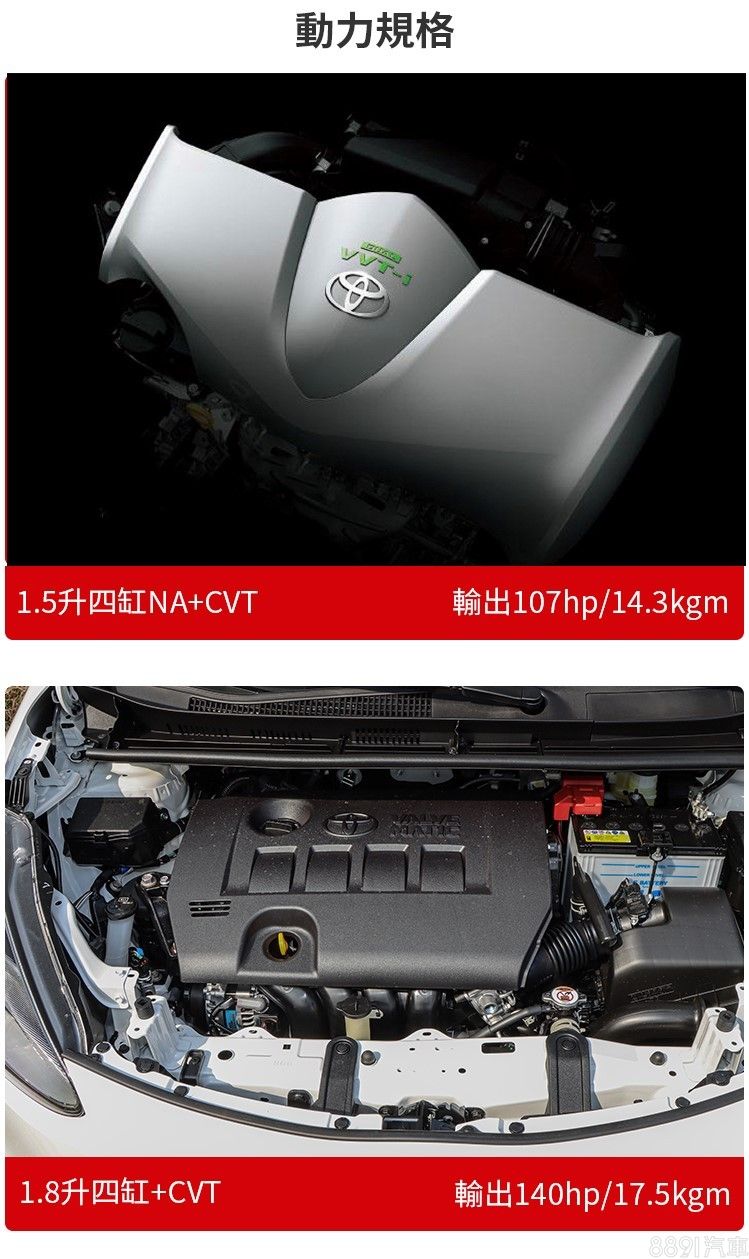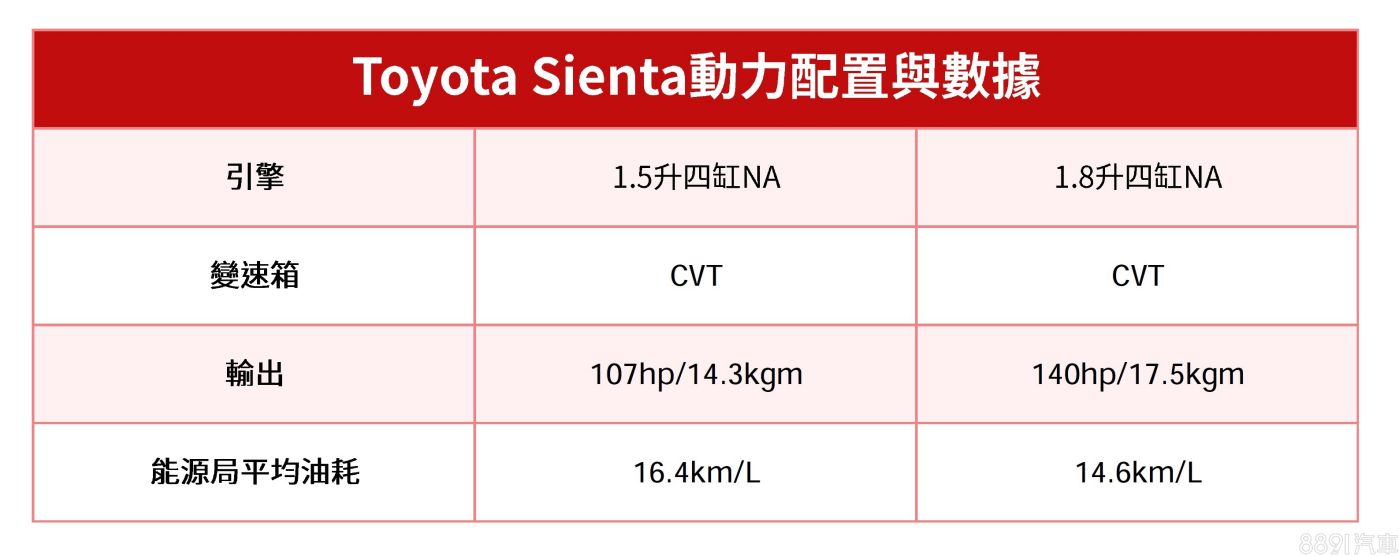 Sienta兩種動力編成,均為四缸自然進氣引擎搭CVT的組合,1.5升提供107hp/14.3kgm最大輸出,而1.8升出力140hp/17.5kgm,能源局平均油耗前者為16.4km/L,後者則為14.6km/L,均為一級能源效率。