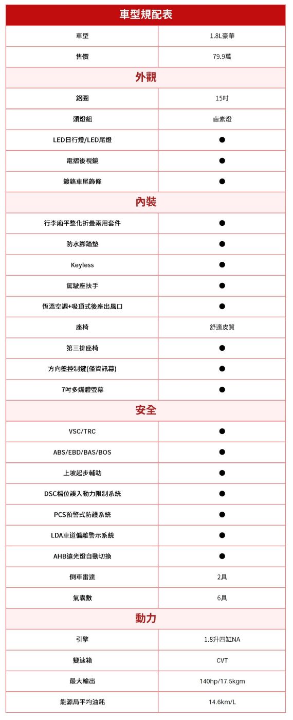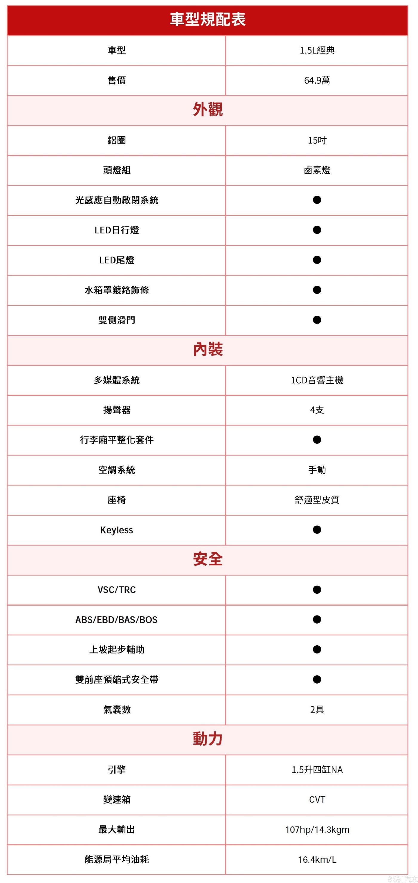 最入門的1.5L經典型,最大優勢便是價格65萬有找,主打企業租賃或營業用車。配備相對陽春,安全輔助也是「乏善可陳」,是編成中唯一沒有TSS的車型,2具安全氣囊的配置更是不符合市場期待,但若是只圖省荷包、又對空間有一定需求的消費者,甚至兼做商用車用途,倒也是一種選擇。