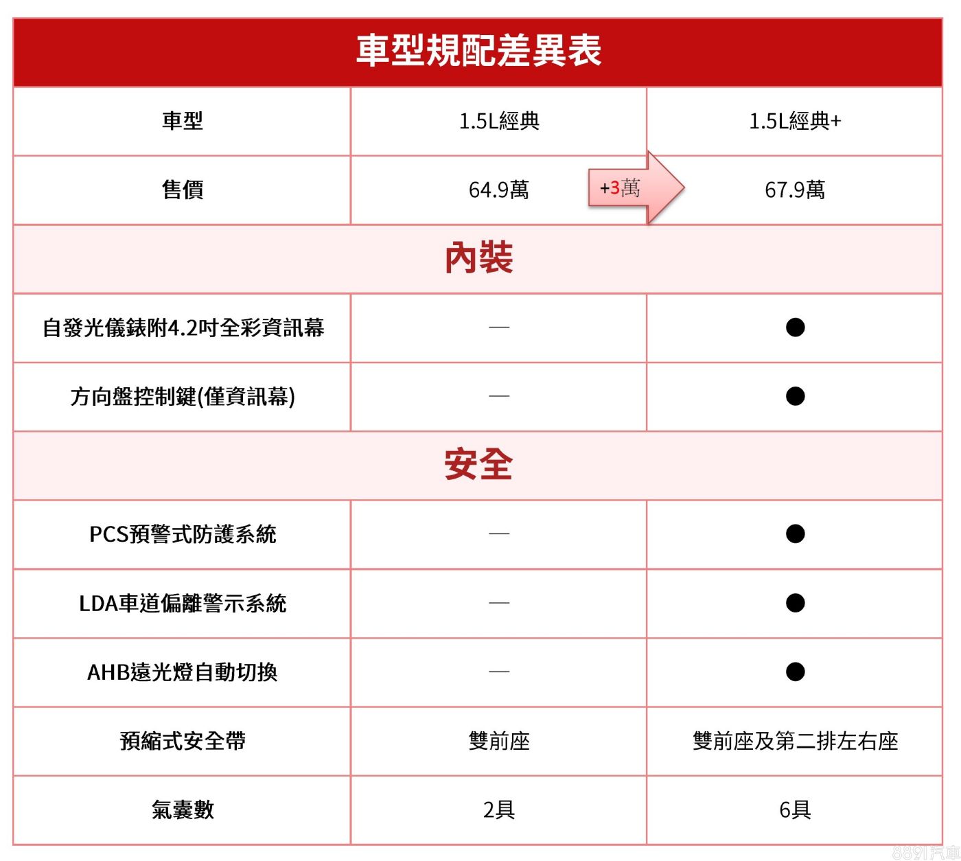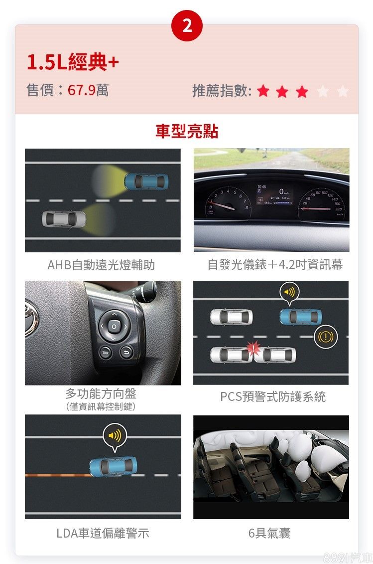 1.5L經典+以上,開始標配新年式改款重點的TSS輔助系統,包含PCS前方碰撞預警式煞車、LDA車道偏離警示以及遠光燈自動切換等功能,但不具備ACC,而安全氣囊增加為6具,安全配備大幅提升,而且僅多添3萬升級也是超值。不過考量空調仍為手動,也缺少多媒體螢幕、倒車雷達等實用配備,因此尚不能入列最推薦車款。