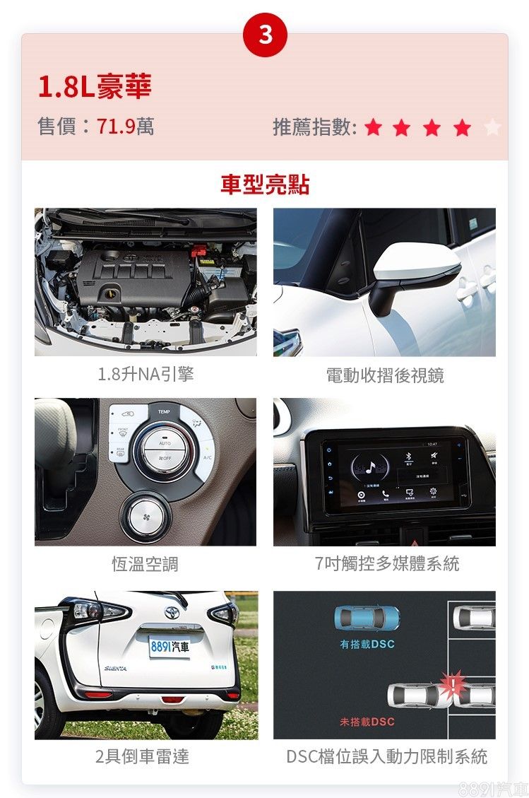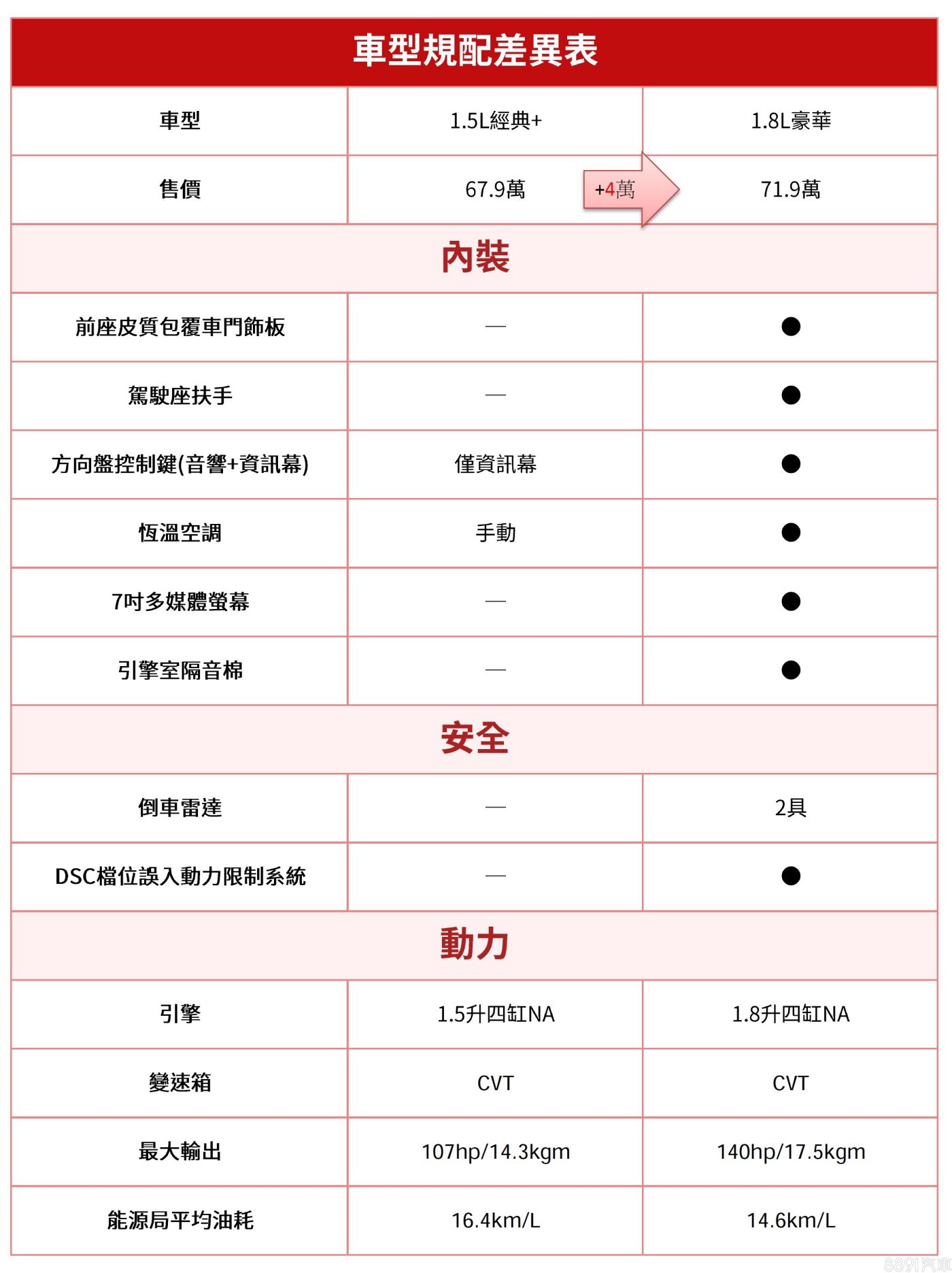 從1.5L經典+多添4萬進階1.8L豪華,多了電摺後視鏡、恆溫空調、7吋多媒體螢幕等實用配備,安全面也補齊2具倒車雷達、DSC檔位誤入動力限制系統,同時改搭1.8升動力,換來出力多了33hp/3.2kgm,以4萬的價差來說其實頗為合算。油耗方面依能源局公布,1.8升動力較1.5升每年得多花約4千元油錢,也都在可接受的範圍,考量稅金一樣,卻換來更有力的輸出,對於駕駛體驗也有幫助,因此整體看來推薦指數升至4顆星。