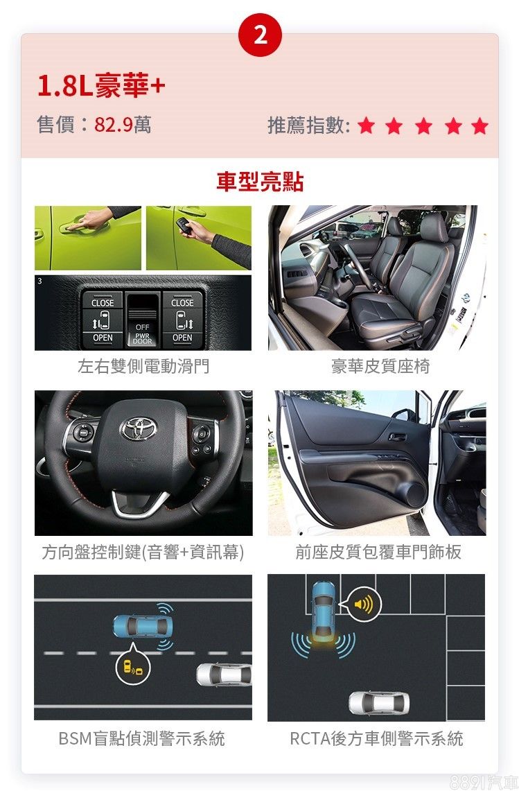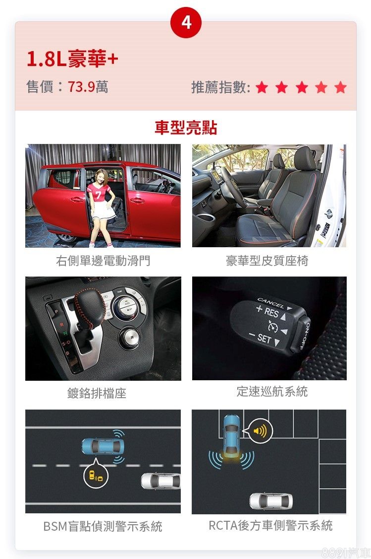 5人座車型最值得推薦的是豪華+版本,除了內外質感精進外,還追加右側電動滑門,增添後座上下車的便利性,另外也追加定速巡航、BSM盲點偵測以及RCTA後方車側警示等,安全層面再加分,以2萬的價差來說可說是相當超值。