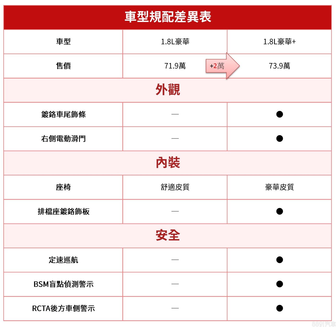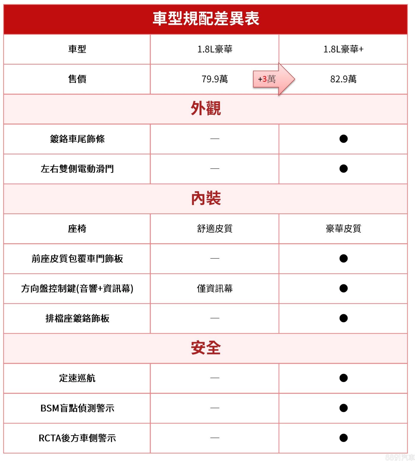 1.8L豪華+車型追加豪華皮質座椅、方向盤控制鍵等舒適配備外,安全輔助也將BSM盲點偵測與RCTA後方車側警示納入標配,但最有感的升級還是雙側都具備可遙控啟閉的電動滑門,以3萬的價值換得上述配備可說是相當超值,安全、質感與便利性都有兼顧,榮登七人座最推薦車型。