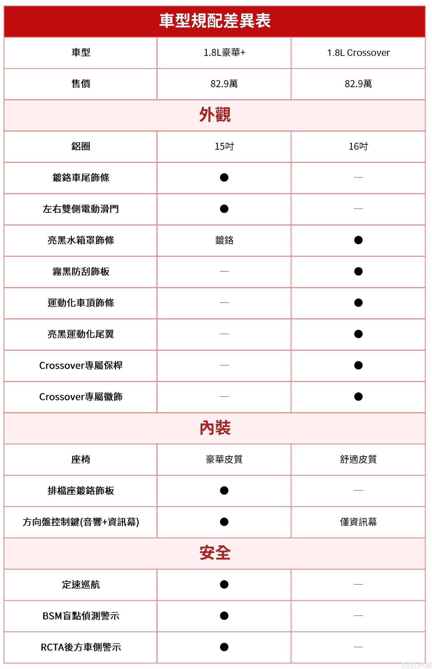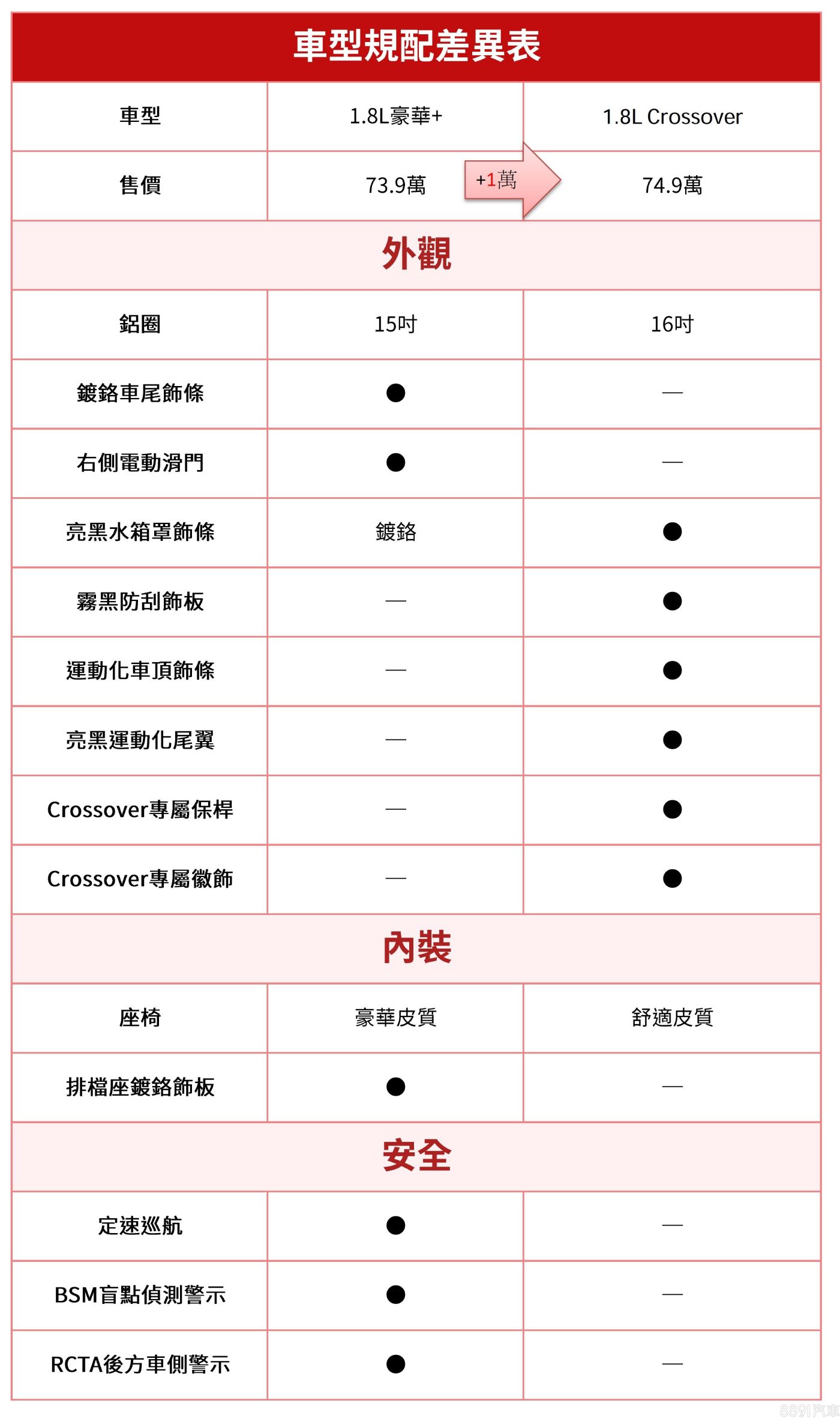 從豪華+升級的Crossover車型,擁有16吋鋁圈、專屬前後保桿、環車防刮飾條、亮黑水箱罩及尾翼等外觀套件,同時換搭專屬懸吊,強化阻尼,距地高也提升20mm,強化地形穿越能力,以1萬的價差來看無疑是超值之選。不過遺憾的是,舒適配備諸如取消右側電動滑門及豪華皮質座椅,就連定速、BSM盲點偵測、RCTA後方車側警示等安全輔助也一併拔除,僅能透過要價4萬的五人座專屬選配件獲得,推薦指數也跟著下修。