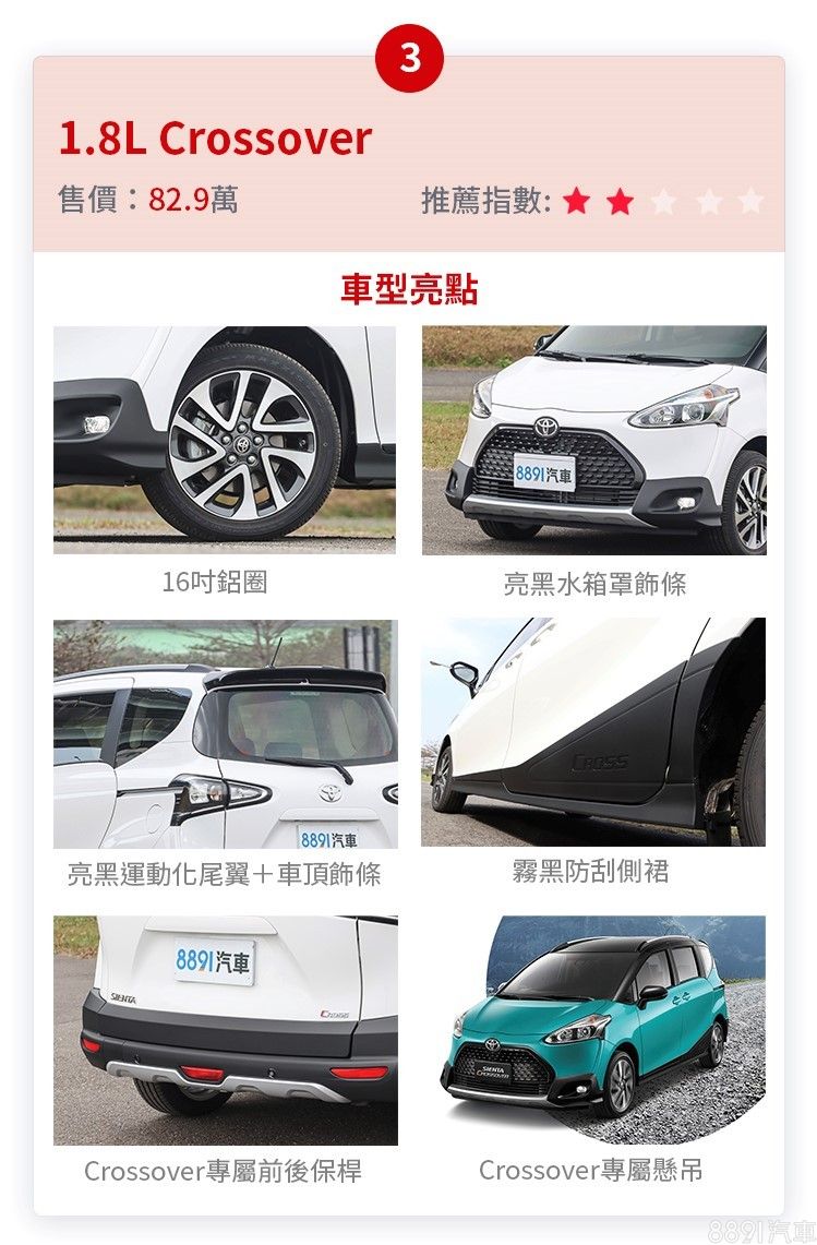 Sienta過去以好入手的定價、靈活的中小型尺碼、機能性空間等特點吸引消費者,但乏善可陳的安全配備一直為人詬病;不過新年式Sienta自第二個車型以上即標配TSS系統,並補齊6具氣囊,有望翻轉這個印象。五人座與七人座均首推1.8L豪華+版本,不僅主被動安全完善,內裝質感與便利性配備也到位;至於新增的Crossover車型,雖然有專屬懸吊與外觀套件強化地形穿越能力,但說到底這類家用MPV開去輕越野仍需三思,最後只能淪為「視覺系」,好看但不實用,再者Crossover因為成本考量,反倒將電動滑門、定速、BSM、RCTA等實用配備移除,僅能由專屬選配套件獲得,大幅降低購車誘因!