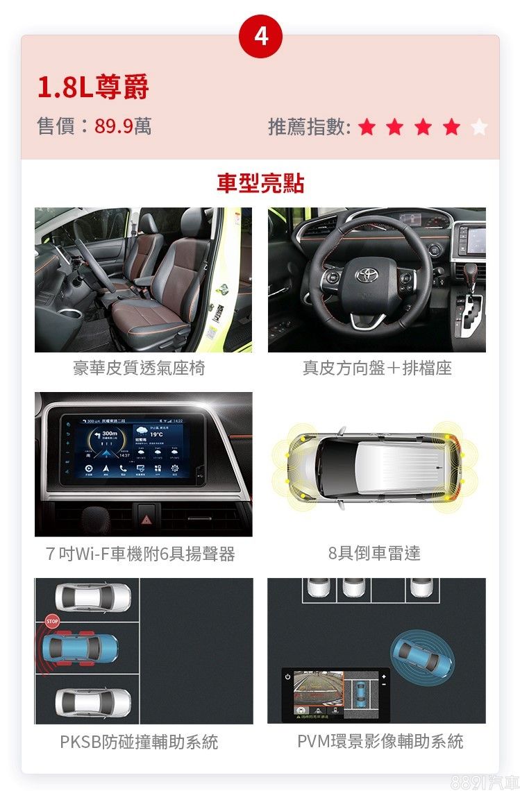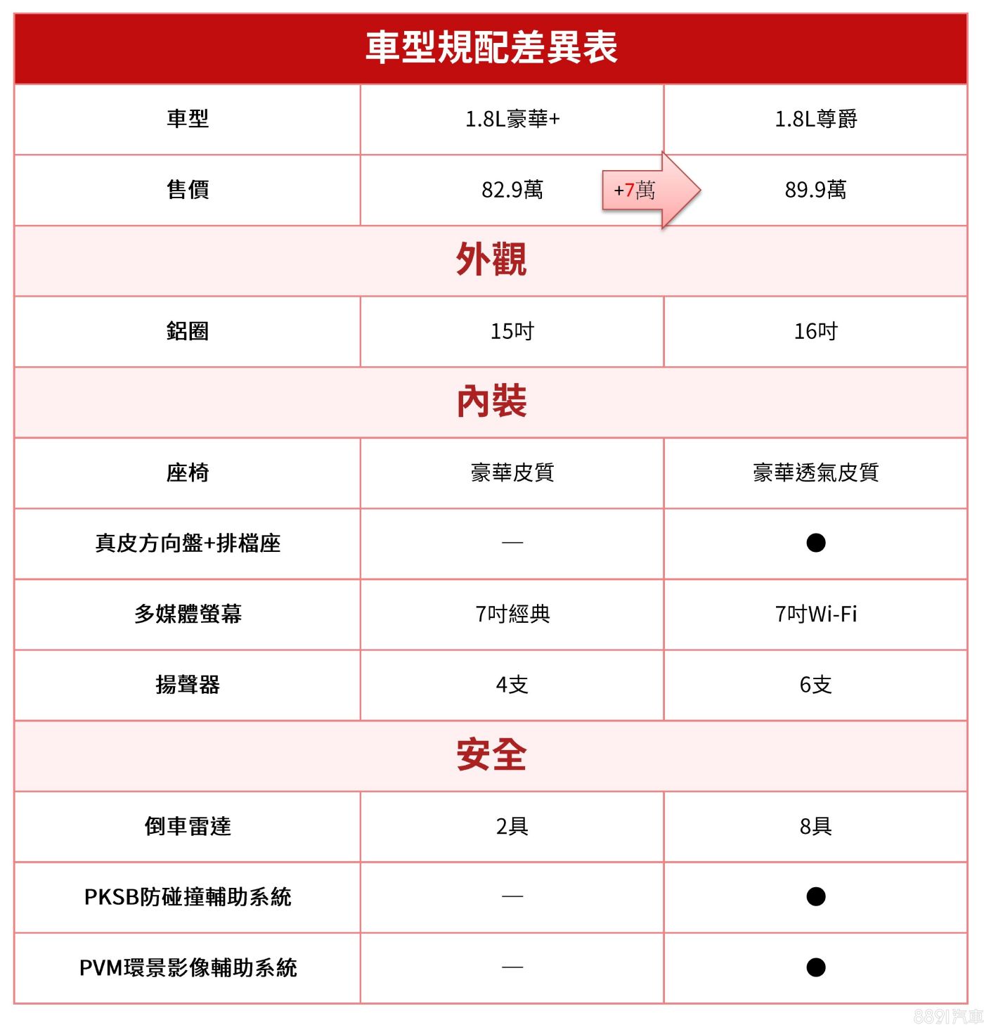 做為車系旗艦的尊爵版,雖然獲得不少「獨享」配備,像是座椅改為透氣材質,真皮包覆的方向盤與排檔桿頭,7吋多媒體系統則升等Wi-Fi主機,安全輔助也多添6具雷達,並追加環景影像與防碰撞輔助系統,上述這些配備升級要價7萬,但多半屬「非必要性」,且直逼90萬的身價也讓人有些卻步,因而拉低了推薦指數。