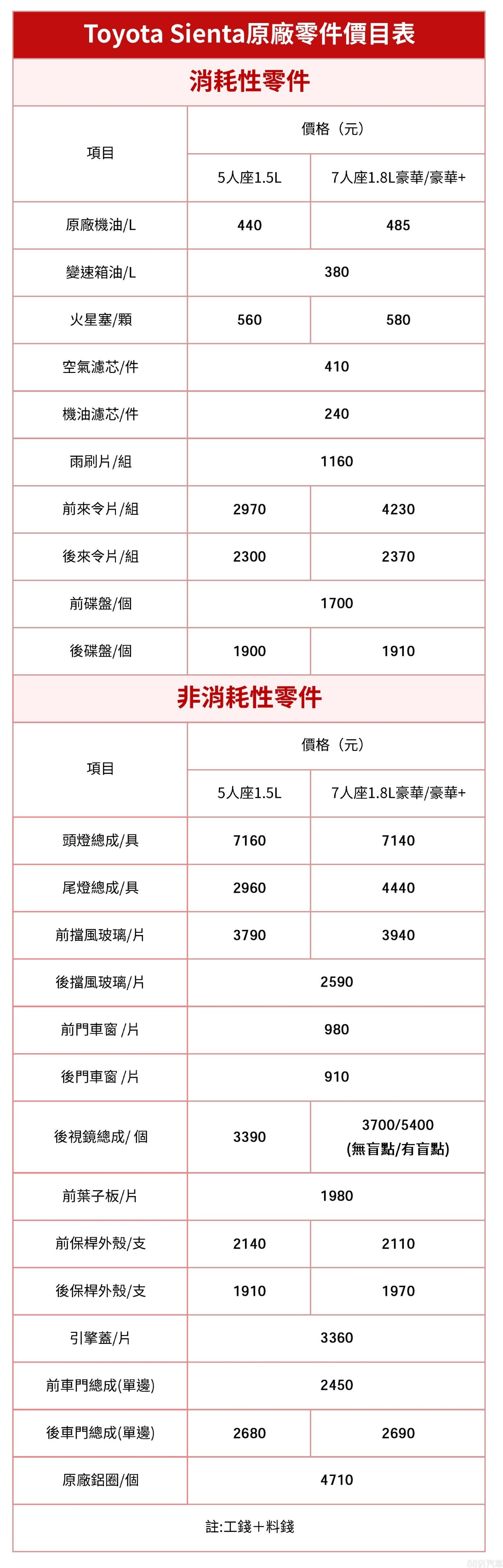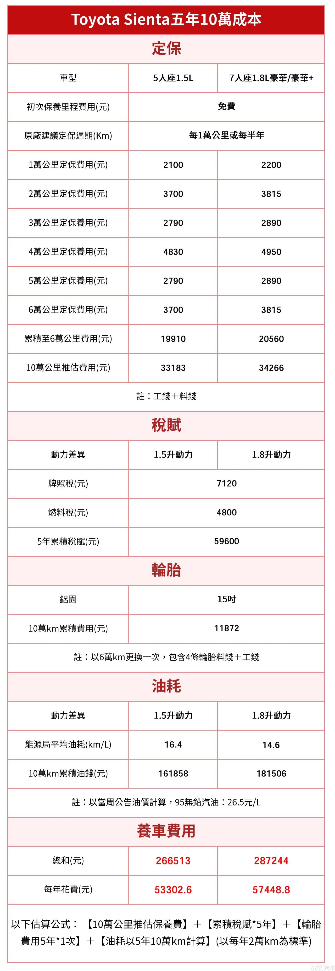 在台灣的稅制下,Sienta兩動力同樣落在1.2~1.8升區間,每年需繳的牌燃稅相當,能源局油耗以1.5升動力的16.4km/L較為出色,1.8升動力的14.6km/L也不算太差,雖然每年須多花4千元油錢,但這也是動力大一點所需付出的代價。以原廠建議的每1萬公里保養週期來看,花費差異都在百元左右,長年下來定保費差異並不大,零件部分1.8升的版本,前煞車來令片以及尾燈總成價錢較高,其餘零件部品則大同小異。