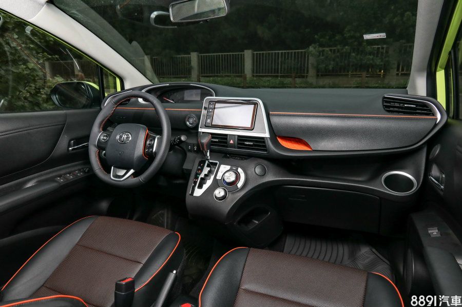 除了特別的外觀造型易受人矚目外,其車內設計花樣亦是不少,配色同樣以「活潑」主題為主打,以熱情的橘色縫線,搭配黑色或米色(1.8豪華5人座以上)。配備上,全車系搭載Drive+觸控螢幕,已具有藍芽手機連結可供使用,操作介面淺顯易懂,加上流暢度算是不錯,唯少了USB與AUX連結插孔,頗讓人在意。中控台採懸浮式設計,排檔處也刻意置於中控螢幕下方,讓中央扶手的置物處更有發揮的空間。(詳細的空間表現,可參考Sienta空間篇)。