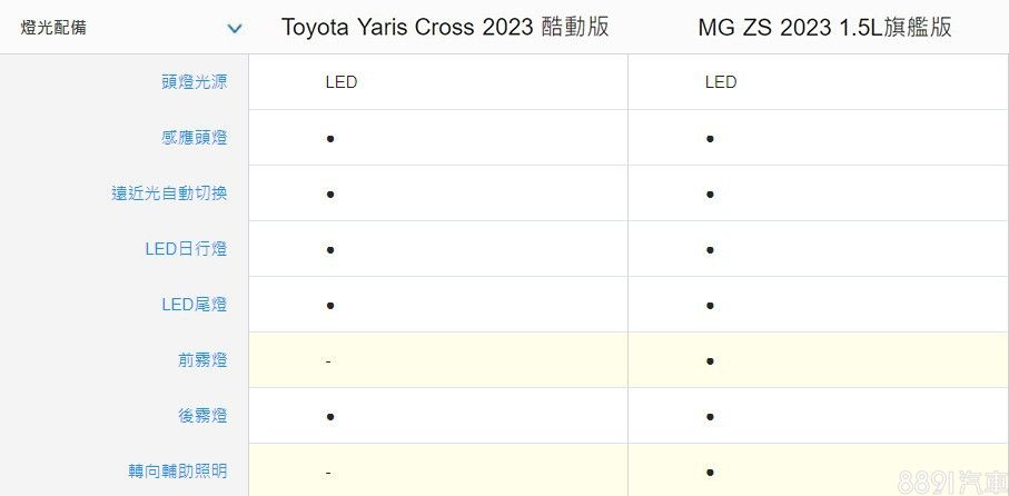 兩車頭尾燈皆為LED光源,且都具備光感應啟閉、遠光燈自動切換等功能,但ZS再比對手多了轉向輔助照明,能協助行駛中的車輛照亮彎路盲區。