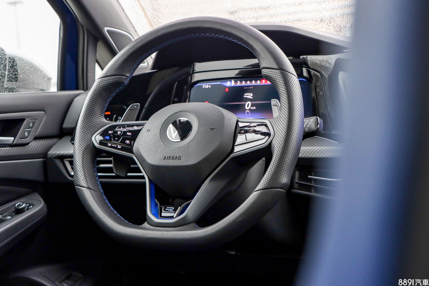 三輻式真皮方向盤握感紮實,搭配R專屬徽飾、跑車式換檔撥片及藍色飾條點綴,熱血氛圍的營造頗到位,加大的換檔撥片實際用起來相當受用,無論方向盤轉打哪一個角度,都能輕鬆撥到,左側按鍵另附有專屬駕駛模式快捷鍵,長按即可快速進入賽車模式,不過若單次按壓切換不同模式時,總覺得按鍵回饋感不夠鮮明,好幾次都按過頭,需多加適應後才會比較好上手。