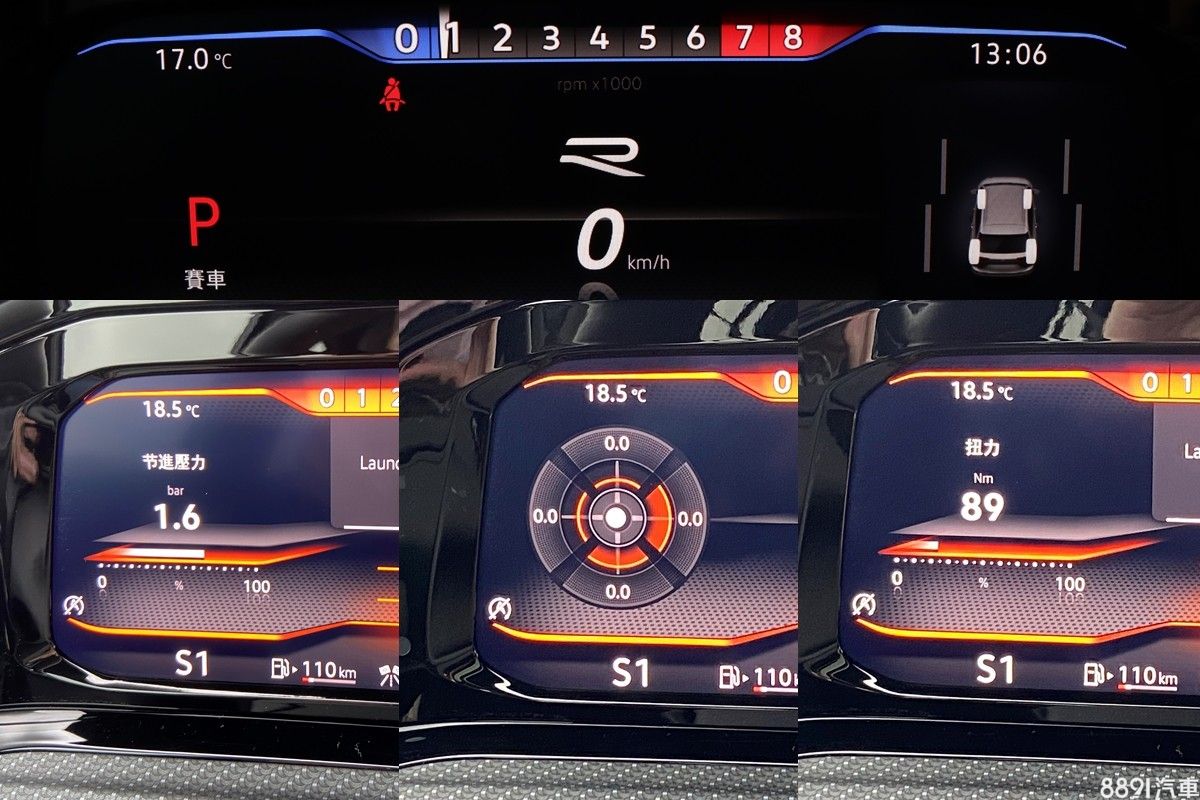 數位儀錶也因為R版,加入不少性能取向的資訊。當切到賽車模式時,轉速錶會以序列方式呈現於儀錶上方,看上去更加直覺也好判別,兩側則可自訂義選擇馬力或扭力輸出值、G值、渦輪增壓值、賽道單圈計時等資訊。