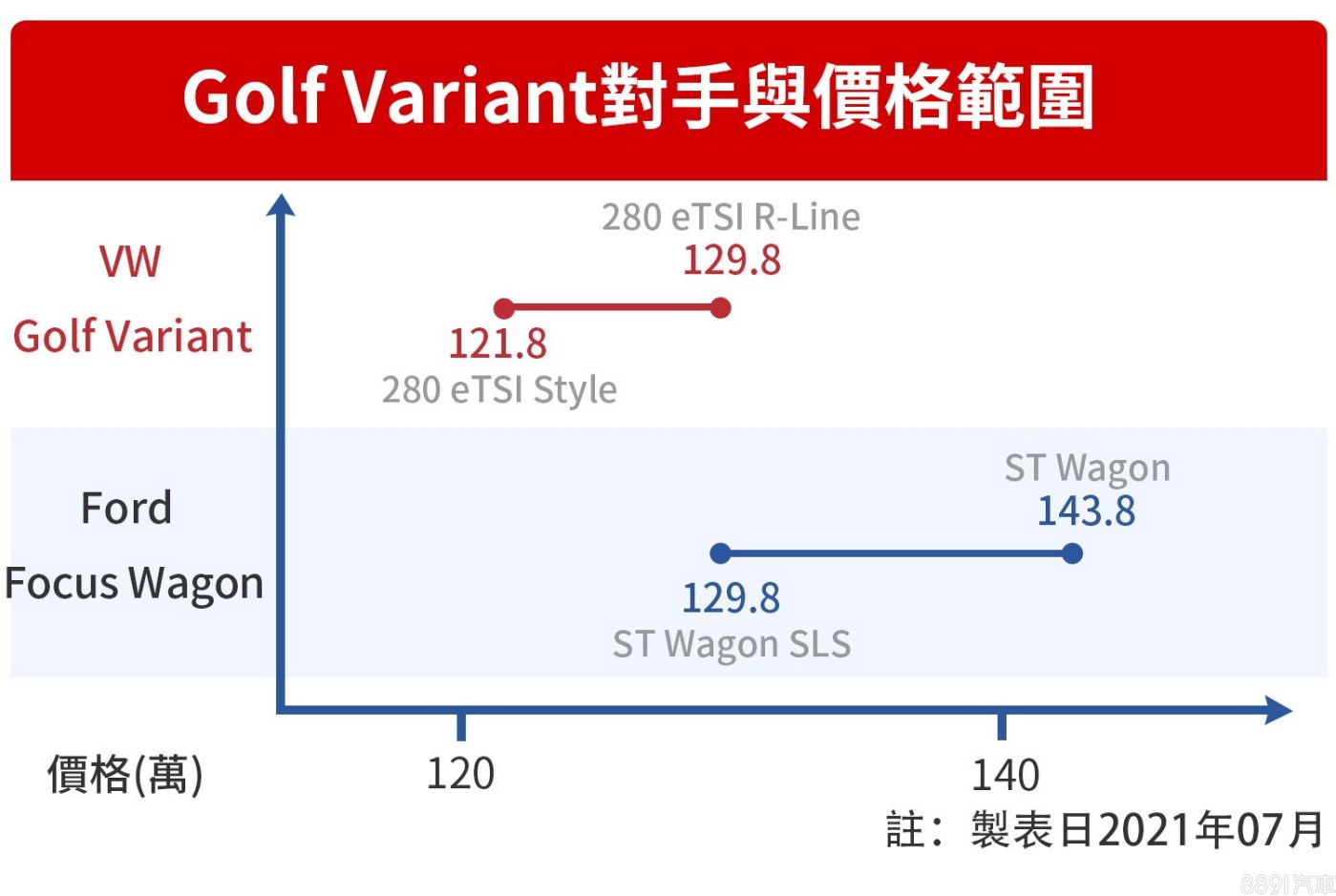 除了五門掀背版本,八代Golf也同步推出Variant旅行車,考量Octavia、Levorg、308 SW等中型旅行車國外都已改款,目前市面上對手僅有Focus ST Wagon一款車型(還有之後會追加的一般版Focus Wagon)。由於Golf Variant僅推出280 eTSI 單一動力,性能面比起ST Wagon溫馴不少、價格上自然也就更容易入手。