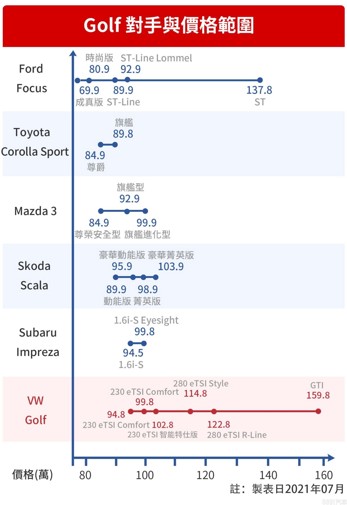 八代Golf同級對手不少,將市面上中型掀背車一字排開,可以看出同為進口身分的Mazda 3、Scala等車款價格多數落在百萬內,Corolla Sport甚至90萬內便能入手頂規車型,相對Golf則得百萬以上才能入手主力銷售車型,尤其動力輸出較具水準的280 eTSI 更是得將預算拉到約115萬,對比之下確實八代Golf顯得沒那麼親民。且即使將目光看向進口性能鋼砲,Golf GTI將近160萬的身價也比圖表中的Focus ST高出一截。
