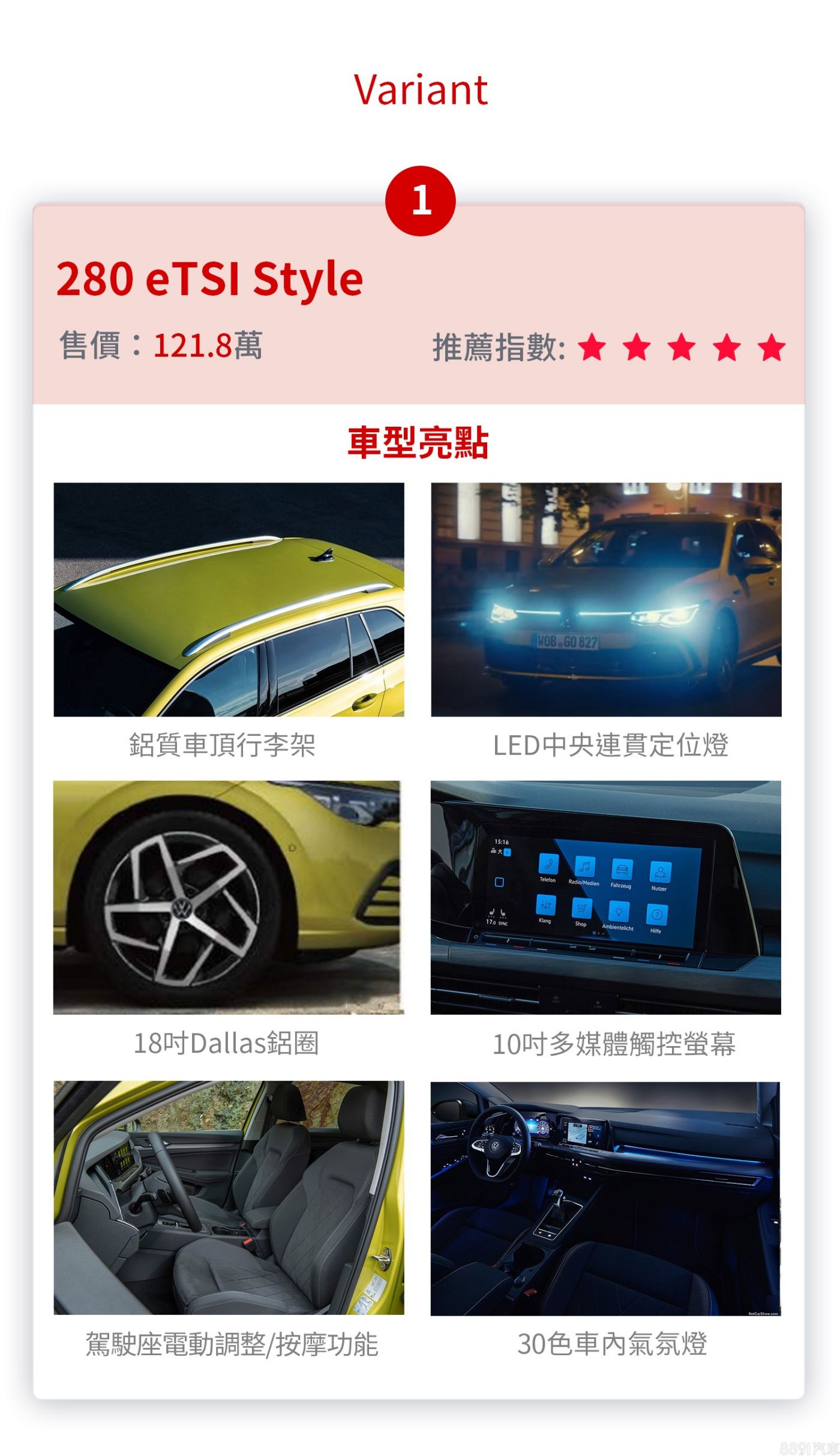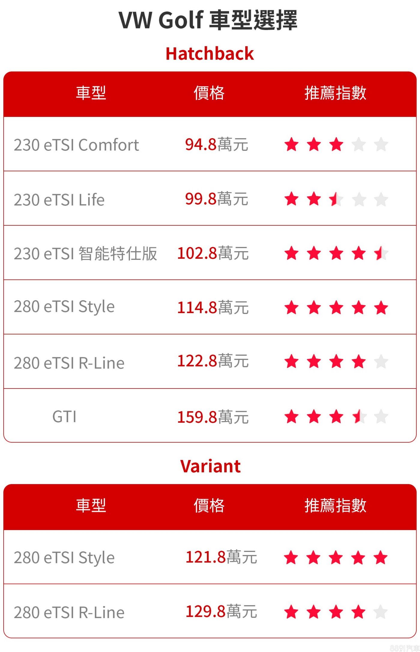 八代Golf標準配備已相對豐富齊全,但最大進化之處還是科技感升級與出色而完善的駕駛輔助配備,也因此102.8萬的230 eTSI智能特仕版可以說是入手Golf最基礎的門檻,趁著目前上市優惠價僅100.8萬的期間相當值得推薦!至於更高一階的280 eTSI Style則在動力與科技性再升級,導入10吋觸控螢幕與完整內裝科技,不論你喜歡掀背款還是旅行車,都是體驗新世代VW最具CP值的選擇。當然在這之上還有R-Line、GTI等性能化配備與車型,但那便是個人喜好層面了,要帥氣、性能、風格都能提供給願意「加價直上」的Golf車主!