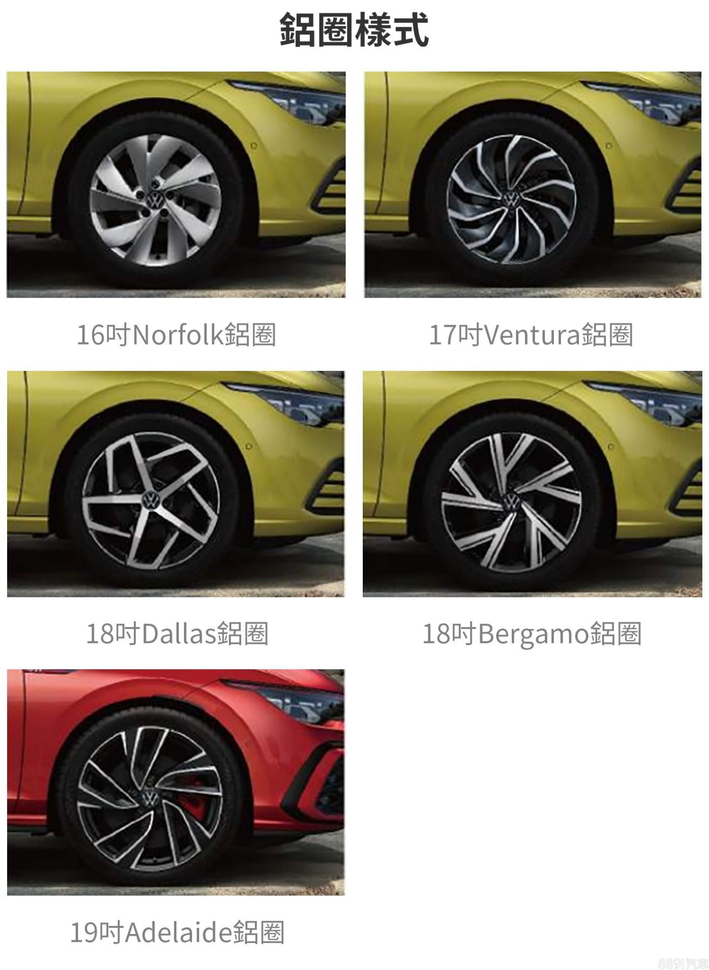 Golf全車系提供多樣鋁圈配置,從入門230 eTSI Comfort所搭載的16吋、到230 eTSI中高階則換上17吋,再到280 eTSI雙車型均採用18吋配置,這回原廠鋁圈設計納入「旋風」元素、除16吋以外也都採雙色烤漆,質感與造型都可圈可點。至於GTI則專屬配置19吋鋁圈,這款鋁圈在海外需要選配,台灣福斯則將其列為標準配備。