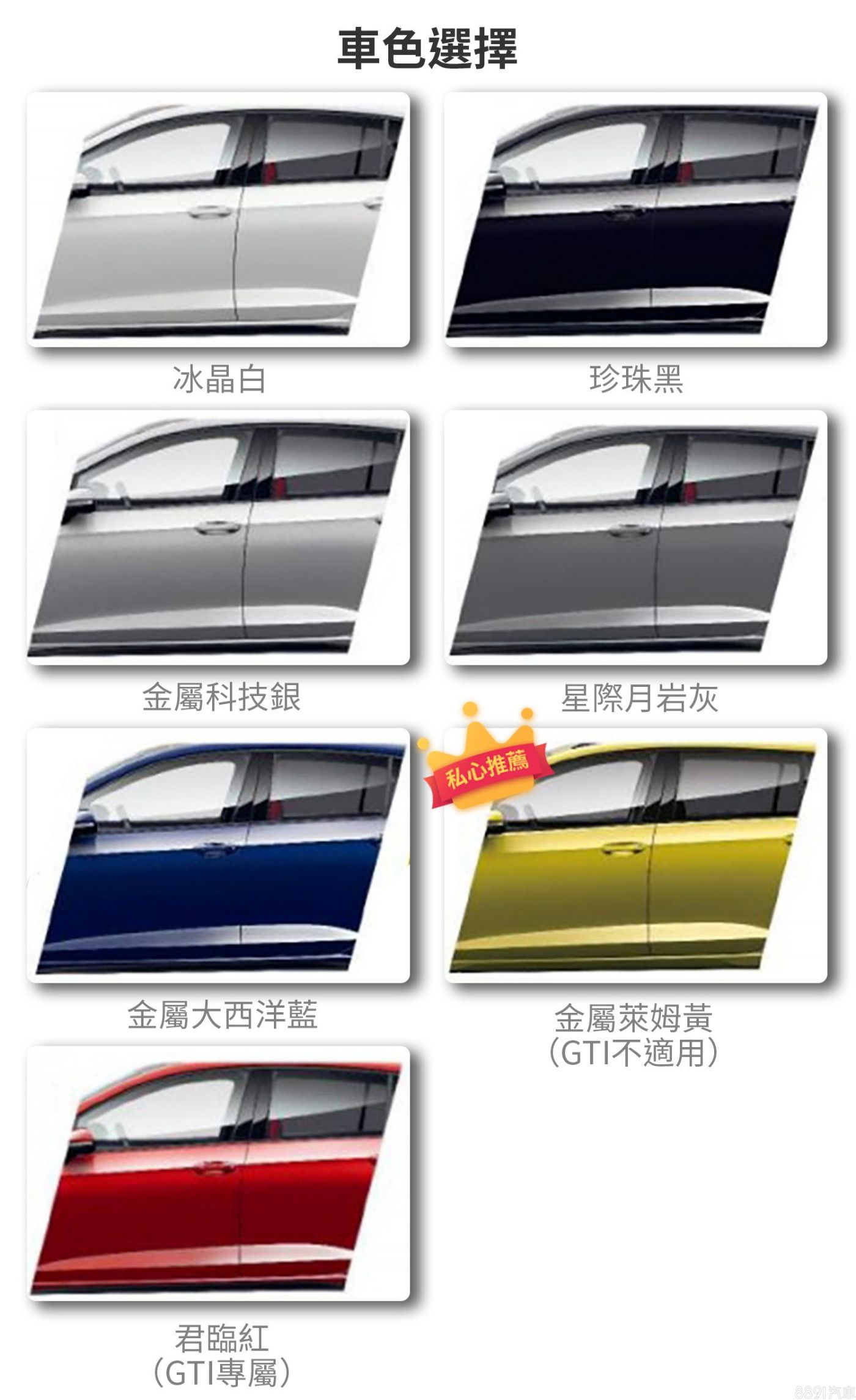 Golf同樣提供白銀黑灰四種較為沉穩的灰階色系,是相對保守卻也保險的車色選擇,此外也提供金屬大西洋藍這款較為深邃的寶藍車色,但最搶眼的還是主打色金屬萊姆黃,從車陣中遠遠就能看到的獨特車色相當值得選擇。至於GTI雖然不能選金屬萊姆黃,但專屬君臨紅卻也是搶眼又性能味十足。
