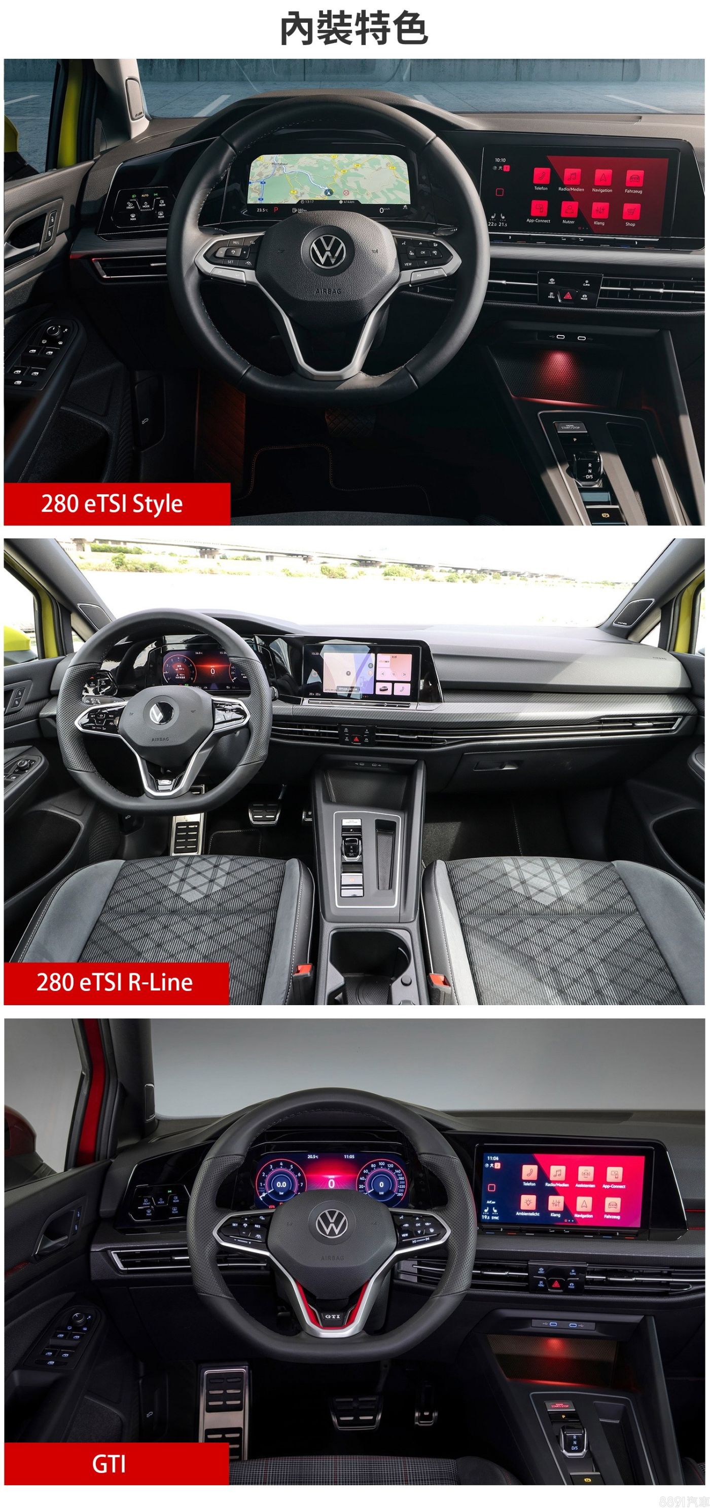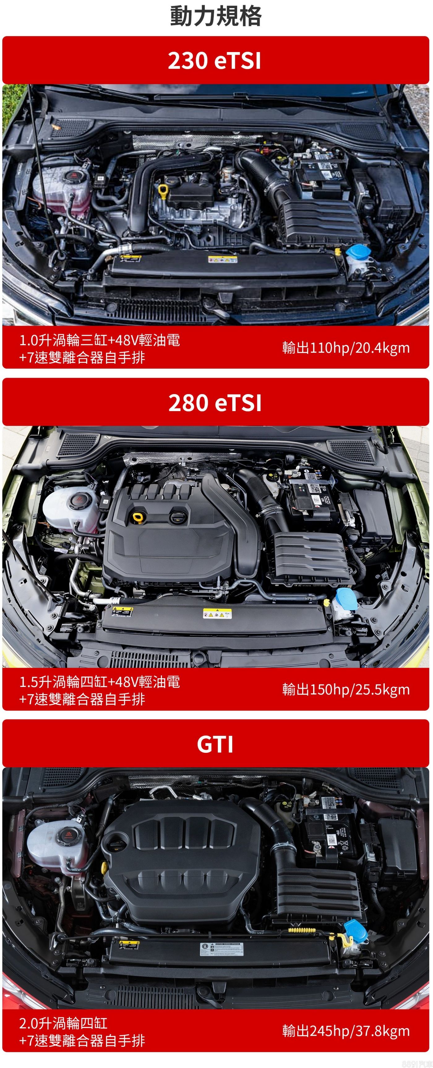 若將GTI納入、這回Golf一共提供三種動力配置,入門款為1.0升三缸渦輪230 eTSI,主力則為1.5升四缸渦輪280 eTSI,兩款均採用最新的48V輕油電輔助,但出力數據與過往完全相同,主要是降低油耗表現。至於GTI則同樣搭載EA888 2.0升四缸渦輪動力,245hp/37.8kgm出力比照7.5代GTI Performance車型。整體而言八代Golf在動力方面並沒有大幅升級,主要還是導入48V輕油電系統以對應排汙規範。