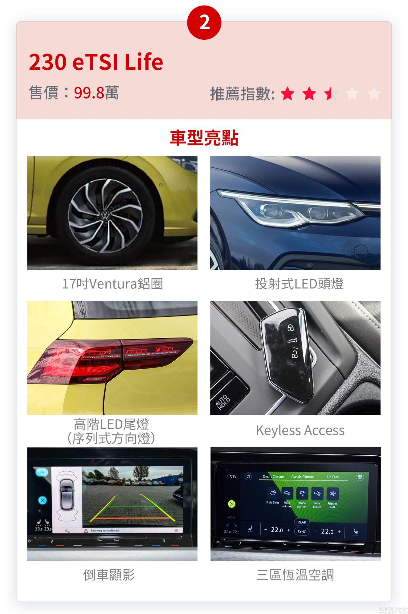 往上一階的Life版則加入部分舒適配備,Keyless、三區恆溫、倒車顯影等更有「開新車」的滿足感,在上市初期雖然有96.8萬的優惠價,看似頗具CP值,不過加一點小小預算就能往上升級智能特仕版,讓這款Life版成為Golf車系中最不推薦車型。