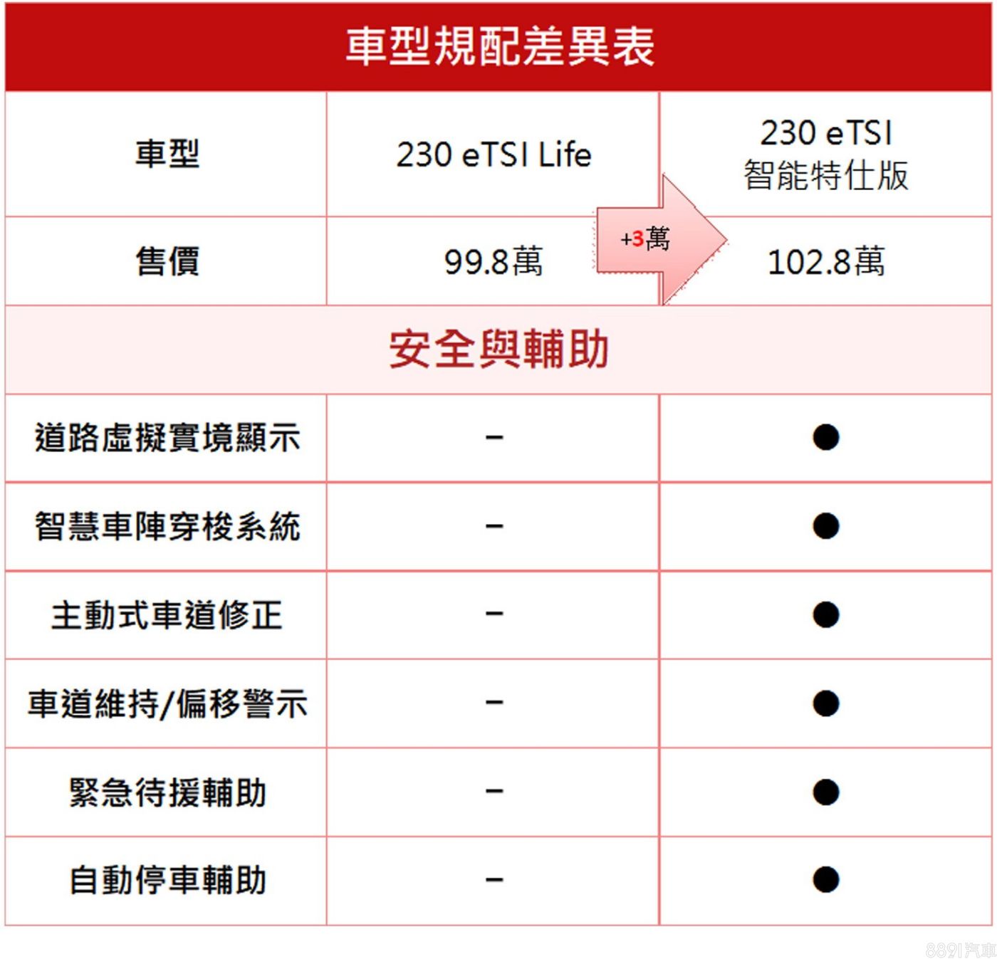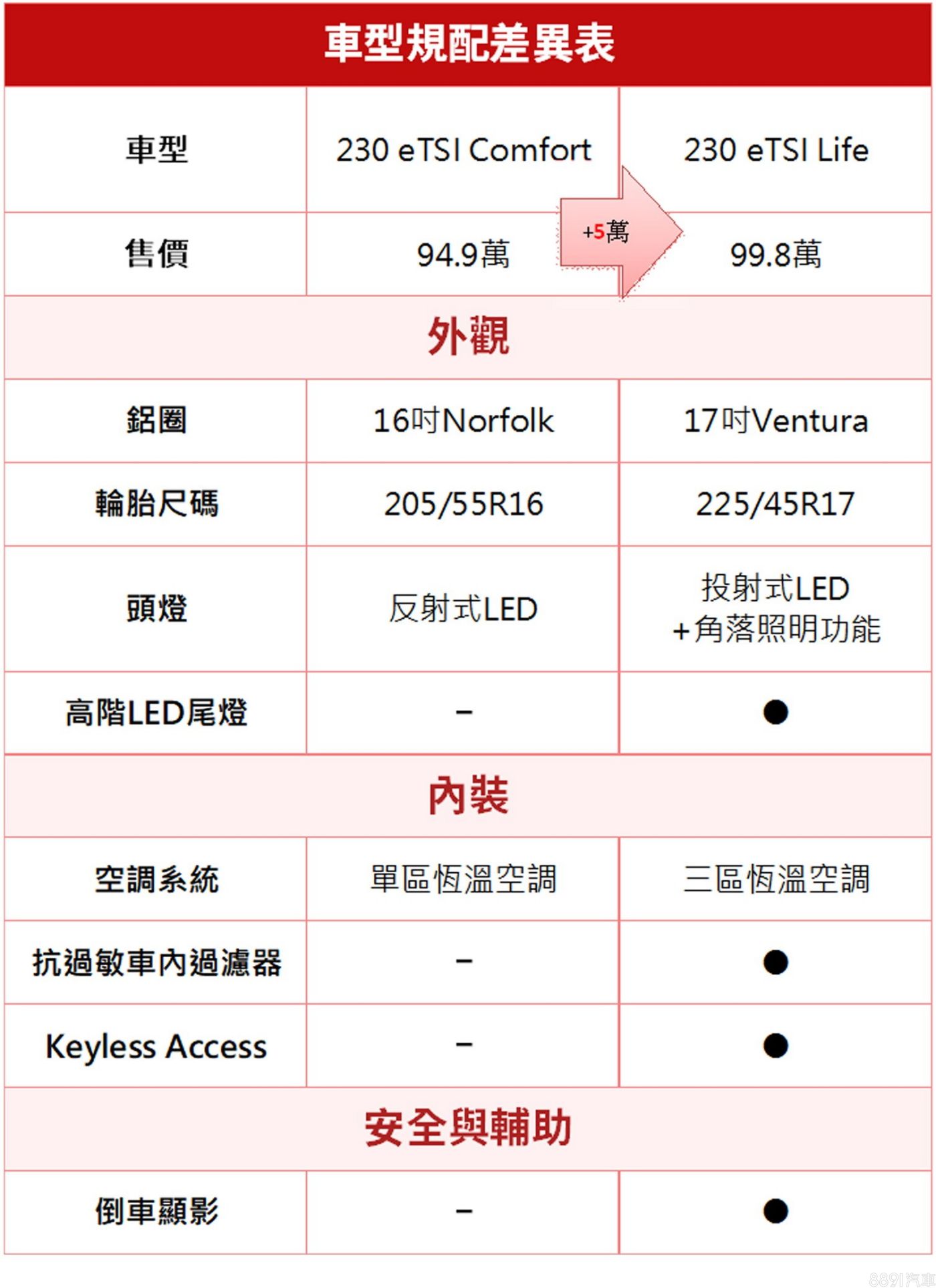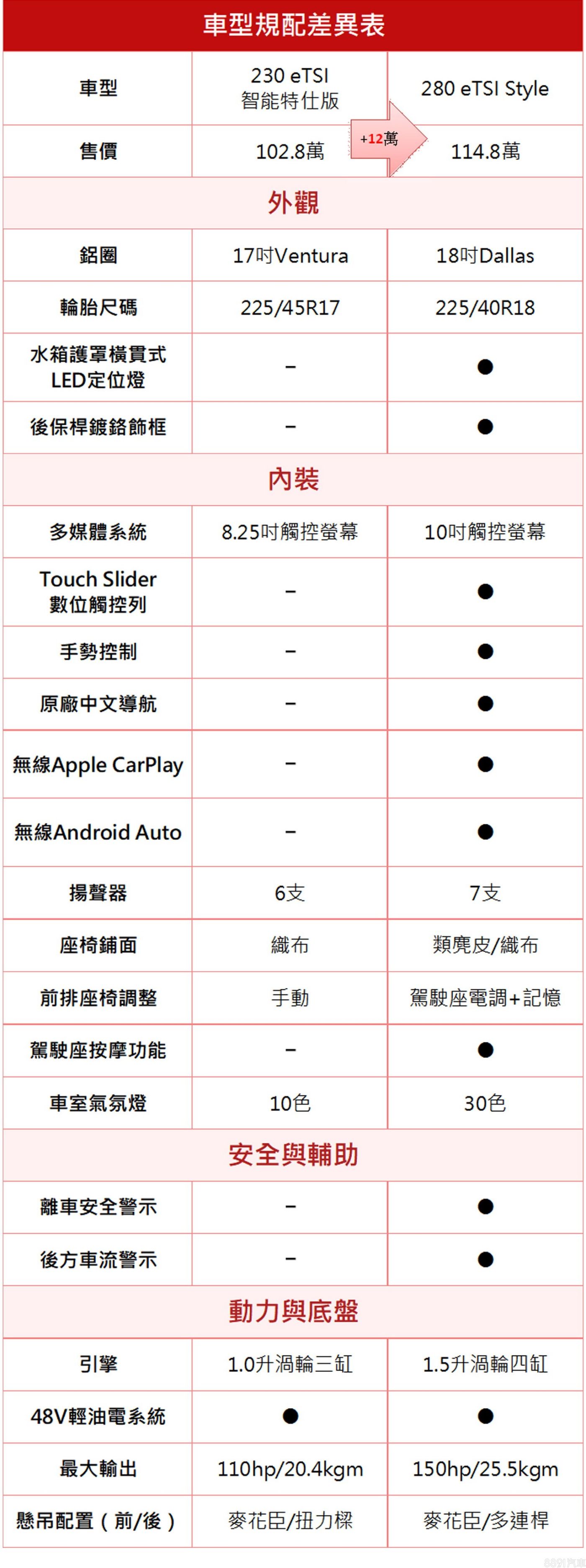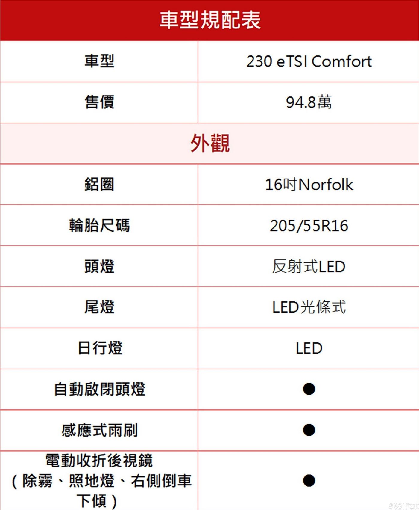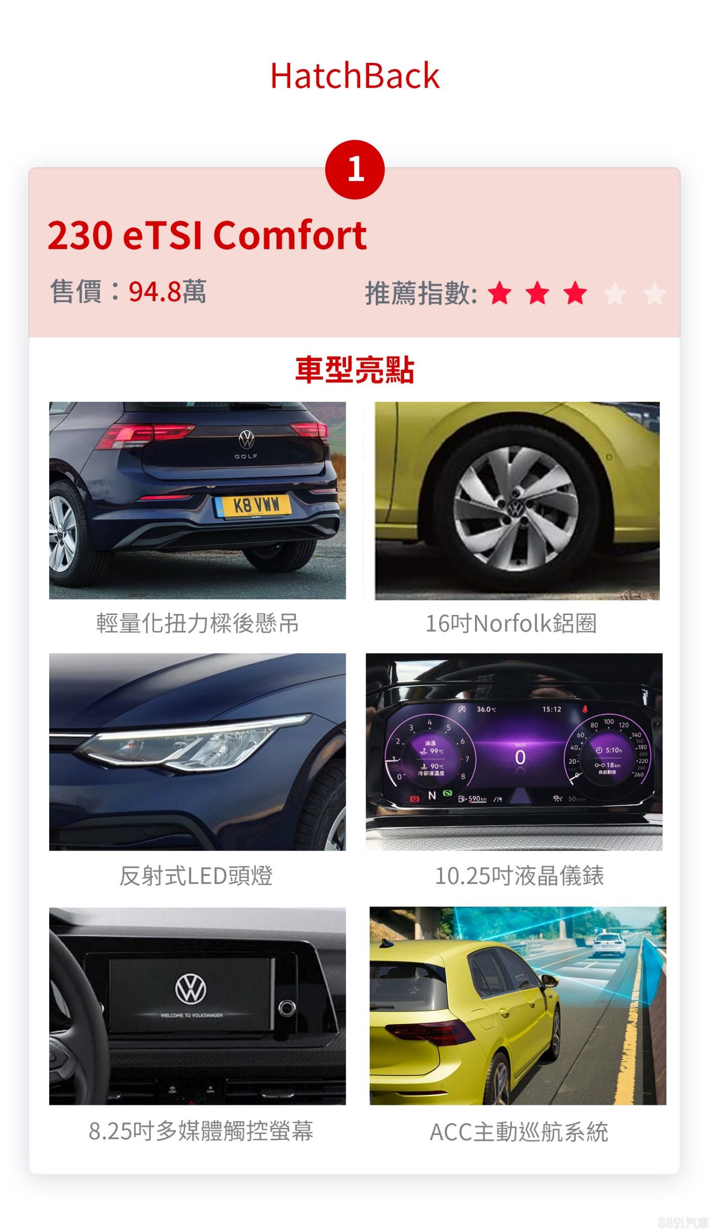 八代Golf作為全新大改款,整體價格帶與過去相比較有著小幅提升,入門款從過去90萬有找、如今230 eTSI Comfort入門售價則是94.8萬元,主力銷售車型230 eTSI智能特仕版、280 eTSI R-Line等也都有著約3~5萬元的價格增長。儘管如此,升級幅度卻也相對吸引人,導入48V eTSI輕油電動力,也加入ACC、10.25吋數位儀錶、LED頭尾燈、線傳排檔座、車室氛圍燈與觸控操作等標準配備,完全不負「大改款」身段、是目前市場同級中新鮮度與科技感最出色的車款。