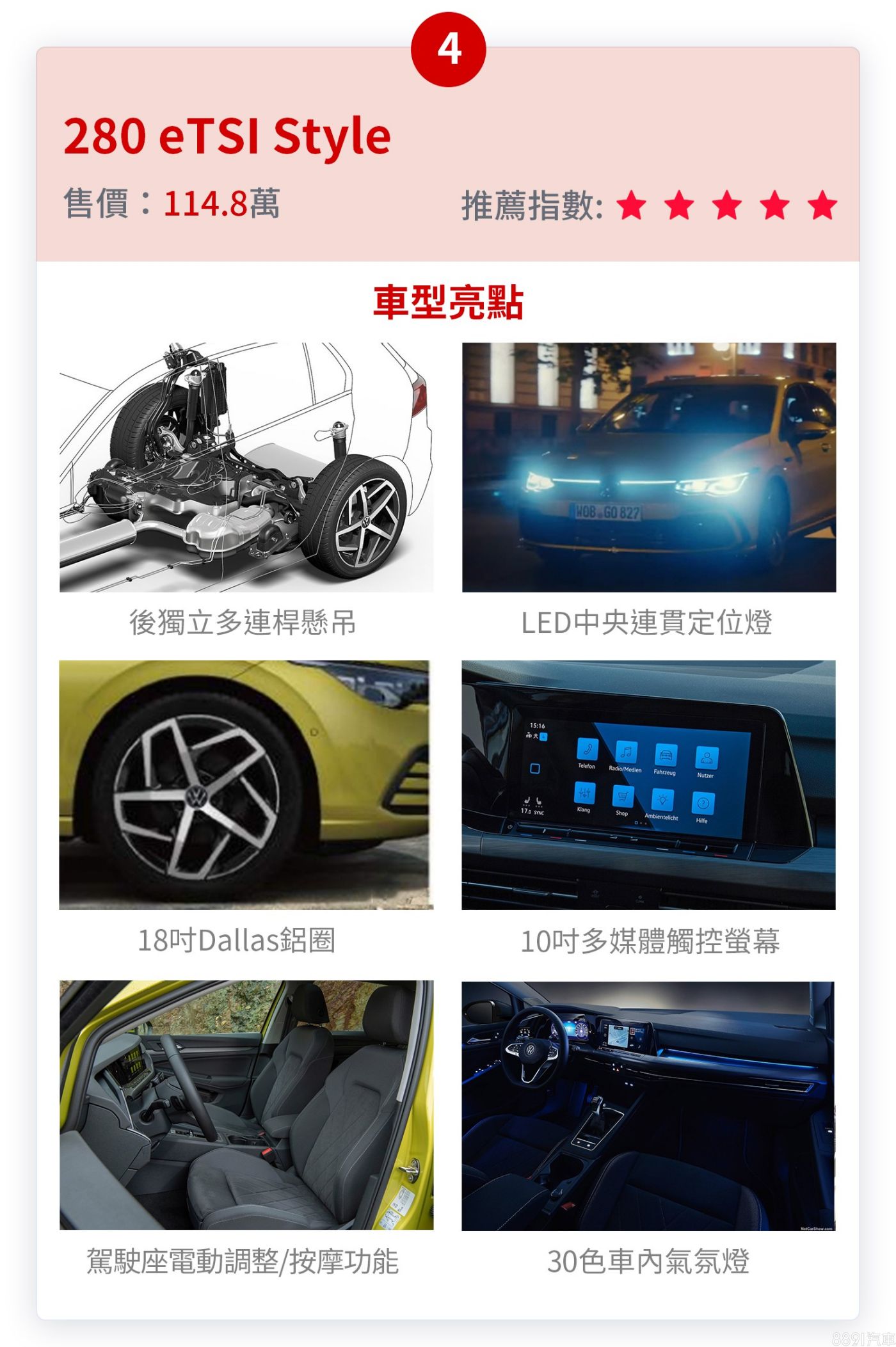 280 eTSI Style則是此次Golf最具CP值的車型,加價12萬除了動力升級之外,外觀18吋鋁圈配上LED中央連貫定位燈,質感已相對出色,內裝更進一步升級最先進的10吋多媒體系統,搭配完整觸控操作與手勢控制、無線手機鏡射等多樣功能。駕駛座更加入電動調整與記憶機能,還有全車系唯一的按摩功能,論豪華與科技可說是中型掀背車之最。