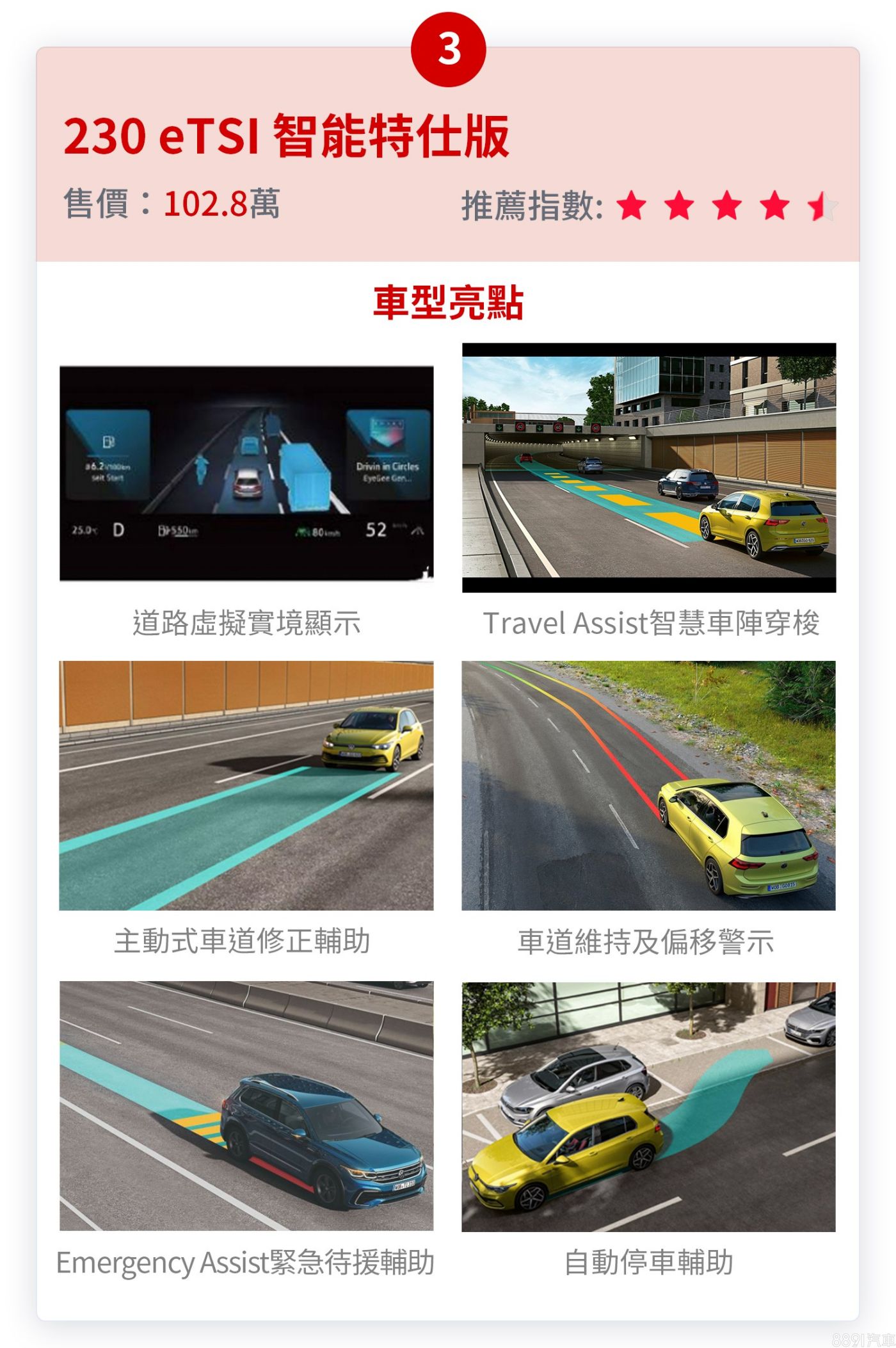 即便作為入門車型,說實話230 eTSI在配備水平已屬出色,LED頭燈、10.25吋液晶儀表、8.25吋觸控螢幕與全速域ACC等重點配備一應俱全,相當適合預算有限的買家。不過缺乏車道維持輔助與Travel Assist等較先進的駕駛輔助配備,因此推薦指數僅有三顆星。