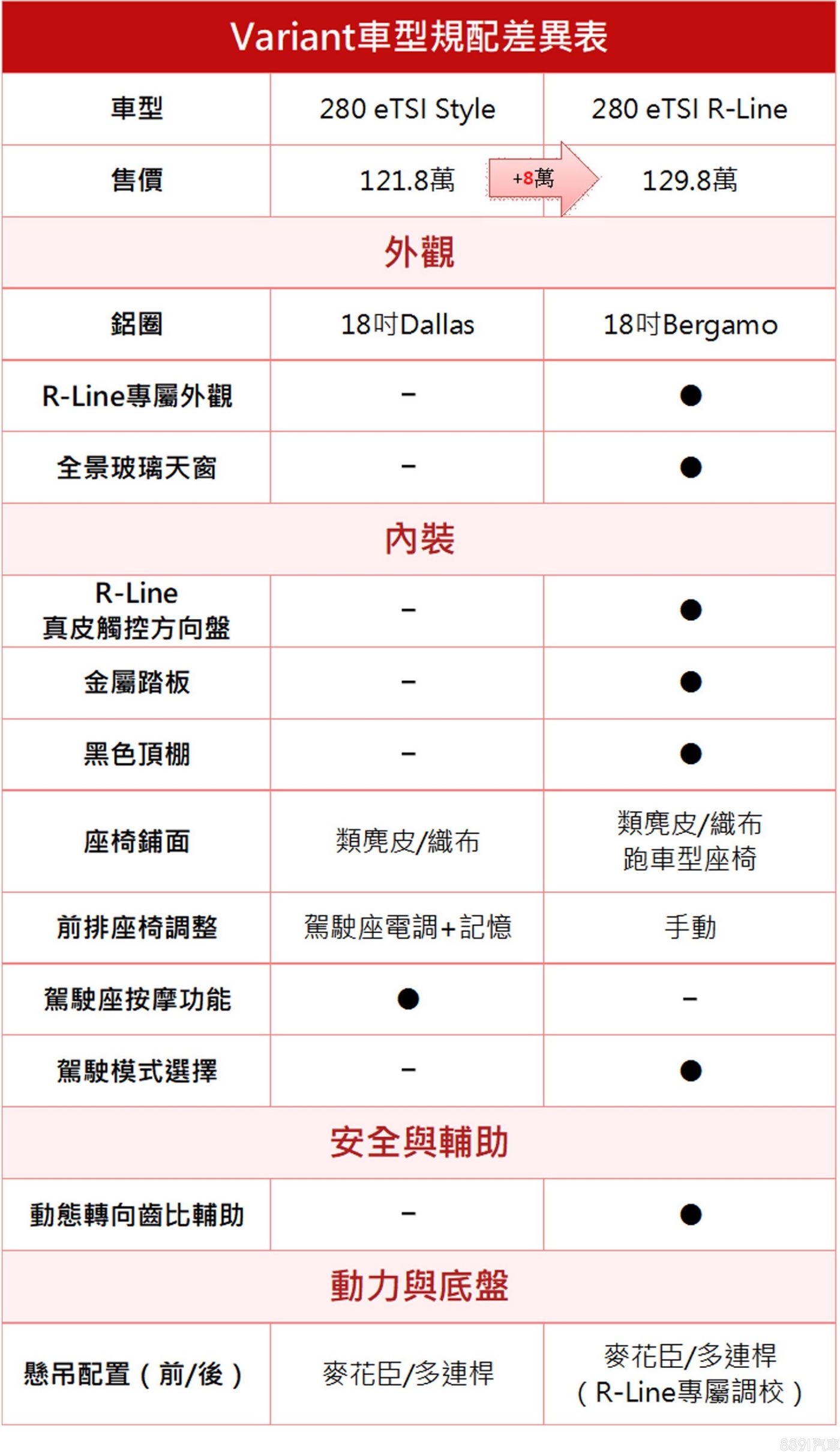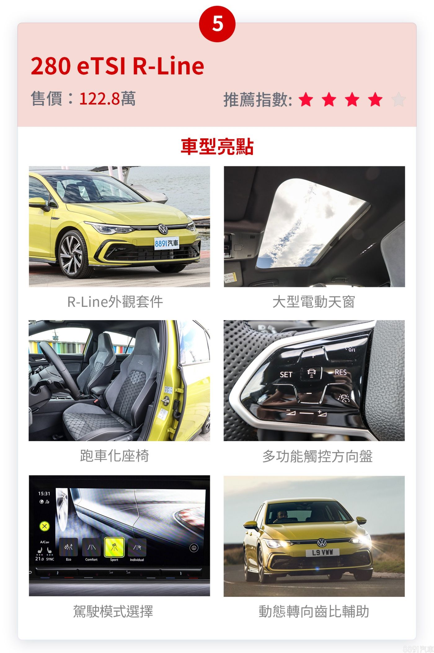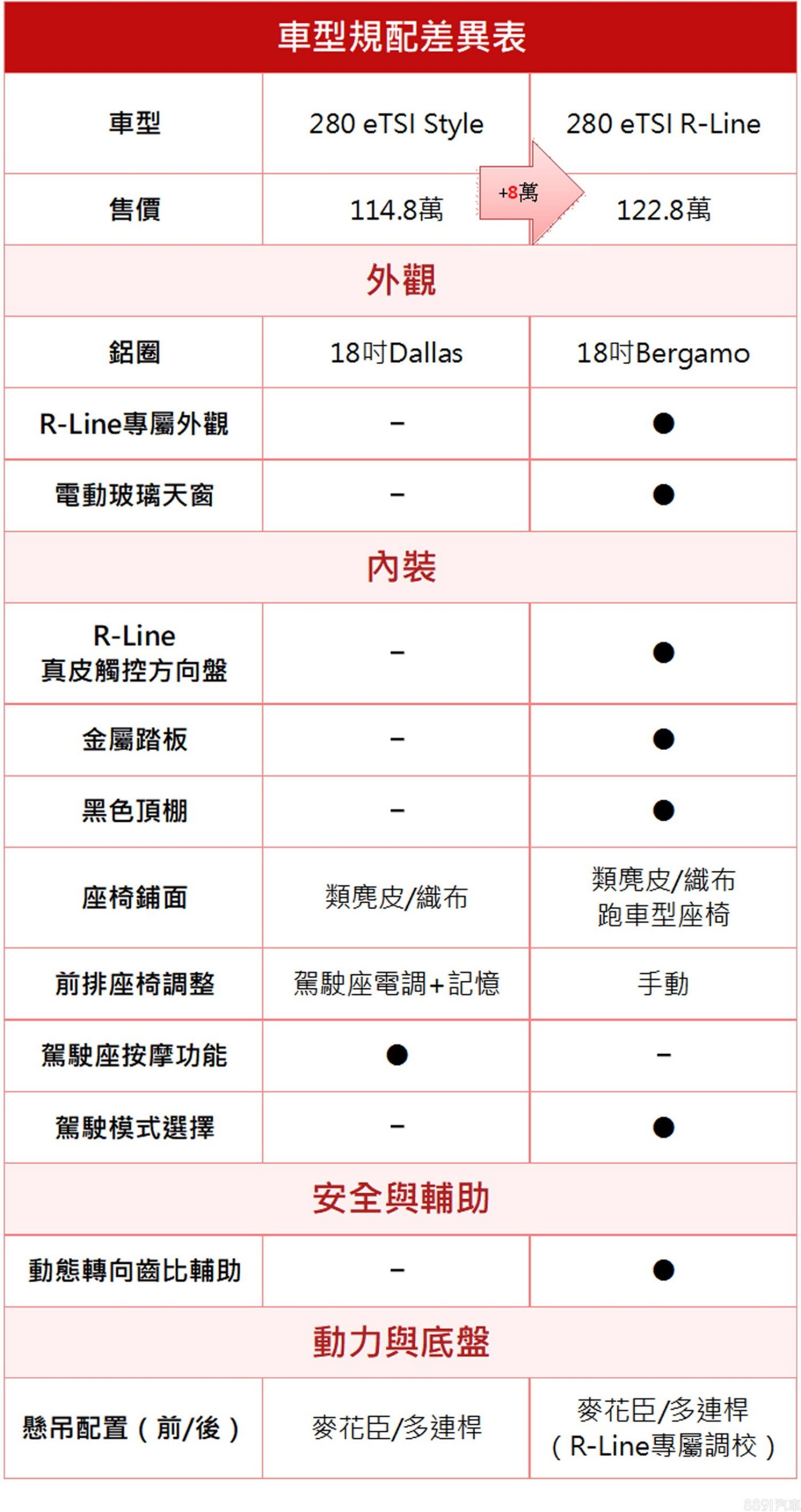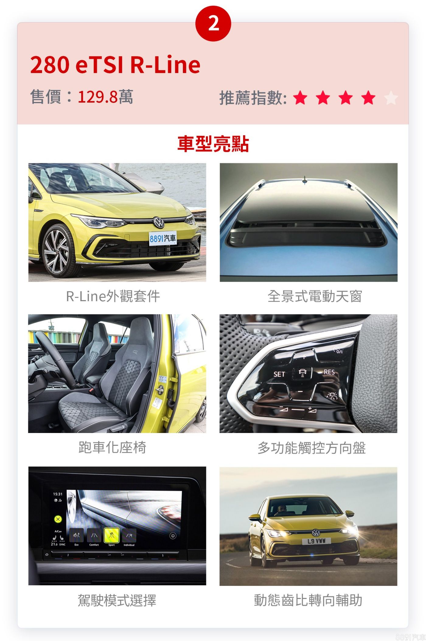 若說280 eTSI Style最具CP值,那麼R-Line就是「把錢變成喜歡的樣子」,運動化外觀、天窗、跑車座椅還有專屬底盤調校與動態轉向齒比,讓訴求家用的Golf更趨運動化。由於R-Line在舒適與科技配備並沒有進一步提升,僅有方向盤按鍵升級為觸控樣式,所增加的8萬元幾乎全數投注在一系列運動感升級,是否划算?就取決於買家個人喜好了。
