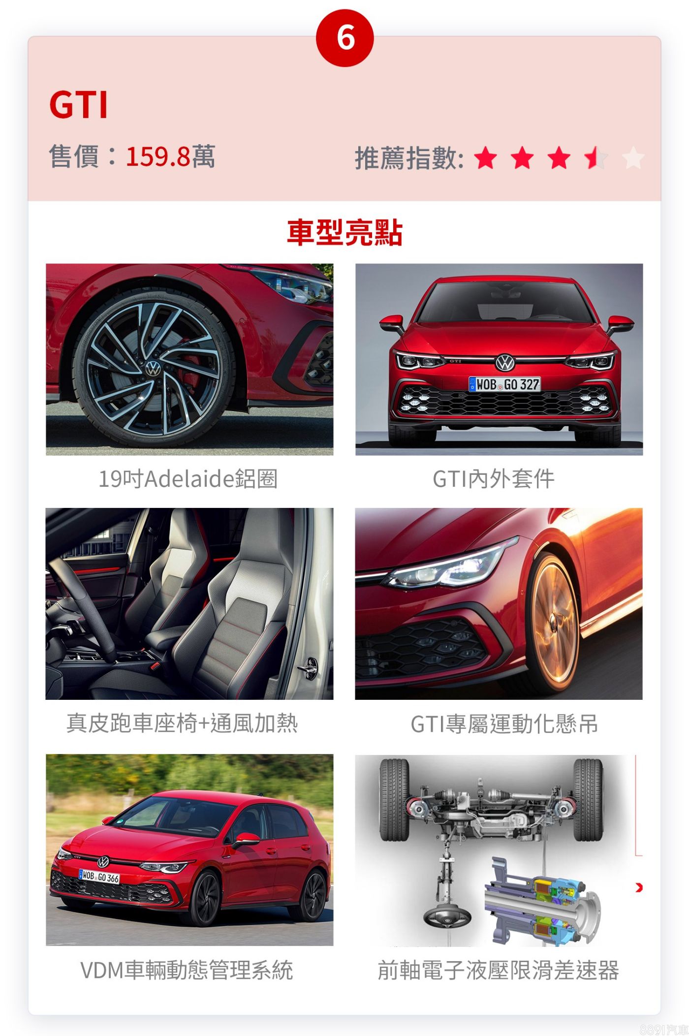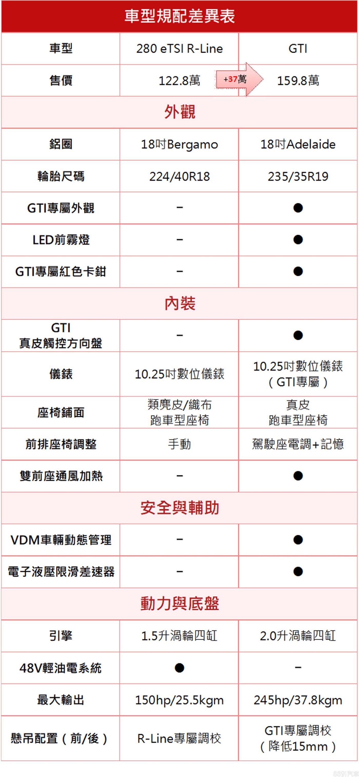 GTI雖然價格高出一截,性能面卻是大幅提升,配有VDM車輛動態管理與前軸電子液壓限滑差速器,配上245hp/37.8kgm輸出與專屬性能調校,原廠0~100km/h加速僅需6.3秒。儘管37萬價差看似全投注在性能面,舒適配備卻也增加真皮座椅與雙前座通風加熱功能,配備水準同樣高標。
