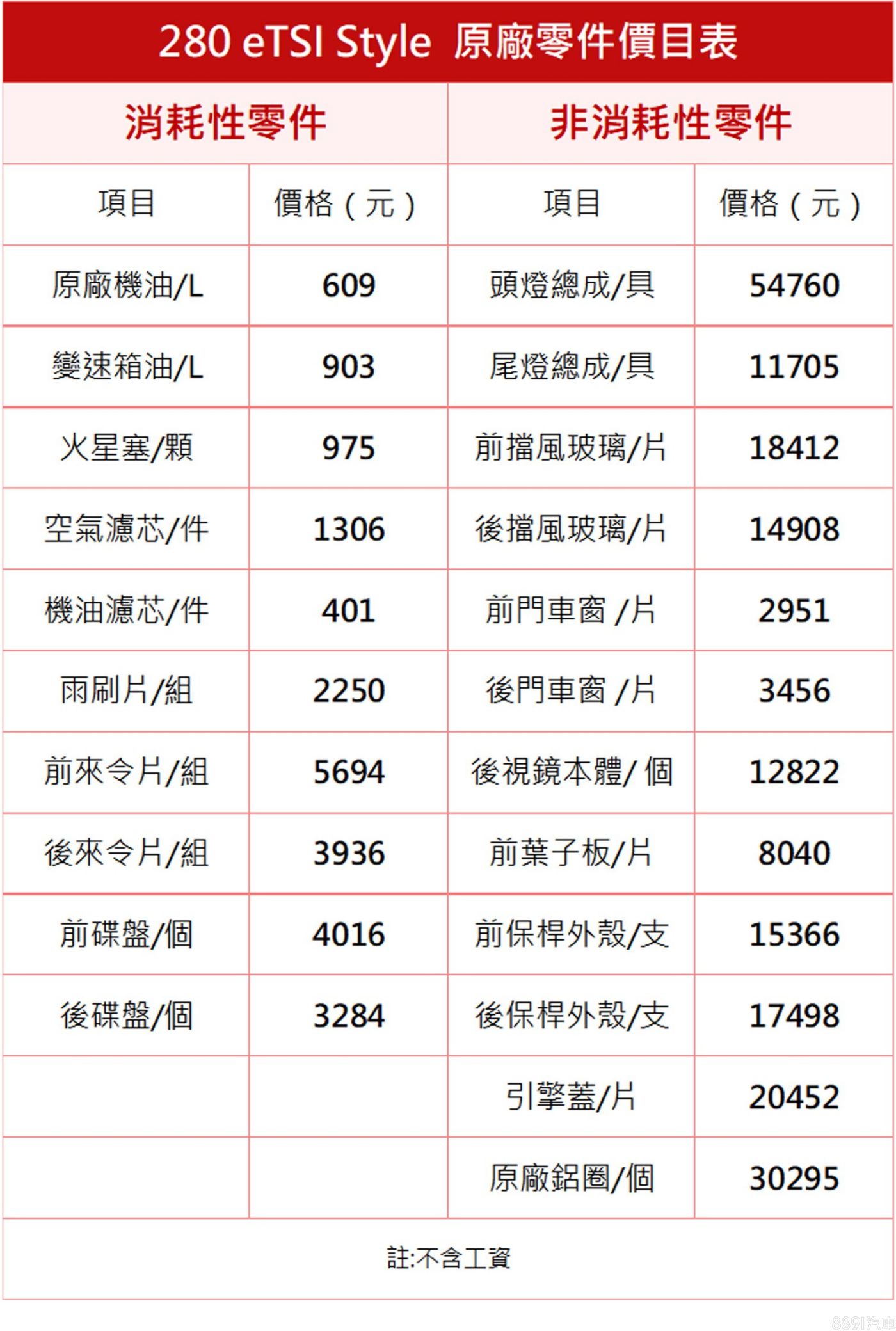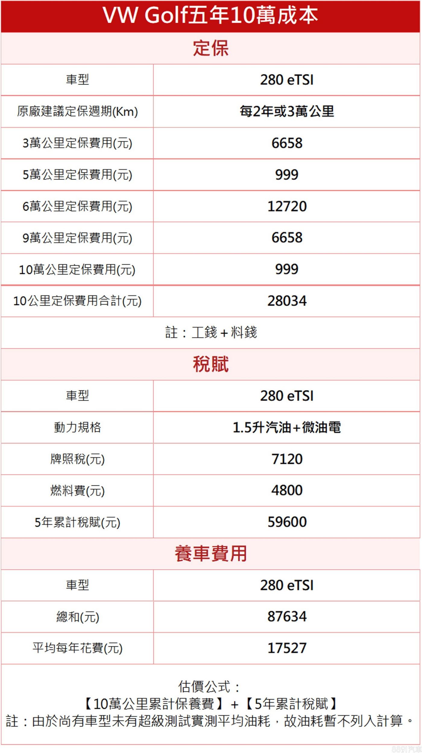 由於台灣福斯汽車宣布將保養週期從原本1.5萬公里/1年延長至3萬公里/2年,因此表格中五年10萬公里成本僅需在3、6、9萬公里時回廠進行保養,但台灣福斯汽車同時也提供回廠「檢查」車況的服務,每次檢查工時費用約為999元,以目前所提供的280 eTSI車型為例、10萬公里定保費用僅28034元,即使算上年度稅金,每年平均養車費用僅17527元(不含油資),算是相當平價的養車成本。