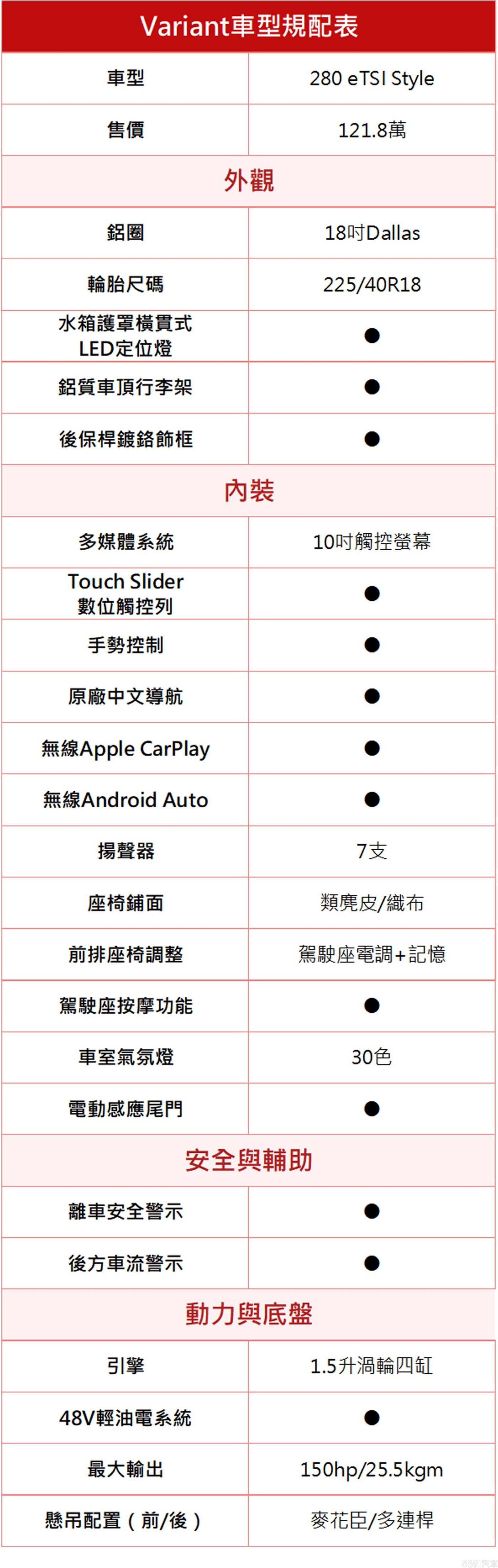 Variant旅行車僅有280 eTSI單一動力,配備水準也完全比照五門掀背提供Style與R-Line兩種版本,Style同樣擁有完整新世代配備與高CP值,唯一差異之處僅有因應旅行車身分新增鋁質車頂行李架及感應式電動尾門兩項實用配備,與掀背相較7萬元的價差換得611L標準行李廂空間,比起掀背版380L出色許多。