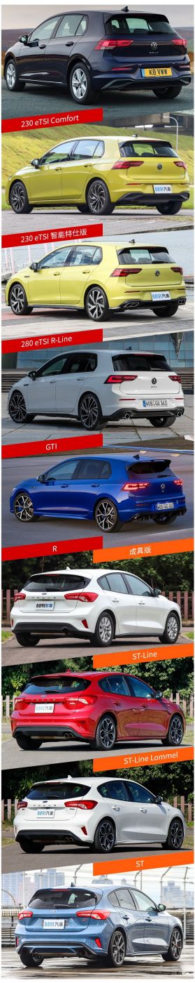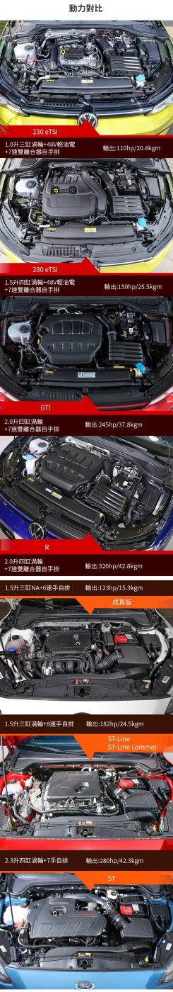 Focus由1.5升三缸自然進氣引擎作為入門動力,和Golf 230 eTSI相比,馬力略大一些,不過渦輪加持的扭力表現更好,稅金與油耗也是Golf 230 eTSI佔上風。主力的1.5升三缸渦輪在數據上勝過Golf 280 eTSI,是一大優勢,不過Golf加上48V輕油電系統之後,則多了科技性和節能效果,而性能版的ST,輸出高於GTI,6.0秒的0~100km/h加速成績也優於對手的6.3秒。