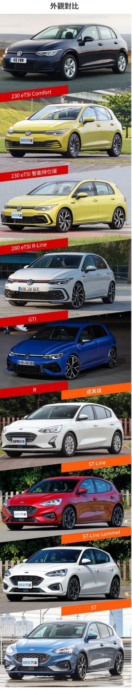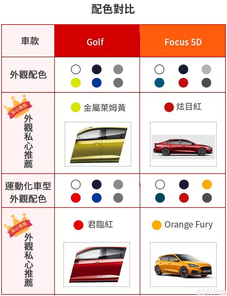 雙方提供的車色選擇數量相當,在一般車型中,Golf主打的金屬萊姆黃頗為亮眼,看過實車覺得能襯托本身的外觀細節,甚至想起當年E46世代M3俗稱的芥末黃。Focus多為比較保險的色調,炫目紅算是最豔麗的選項,年輕就該秀自我。